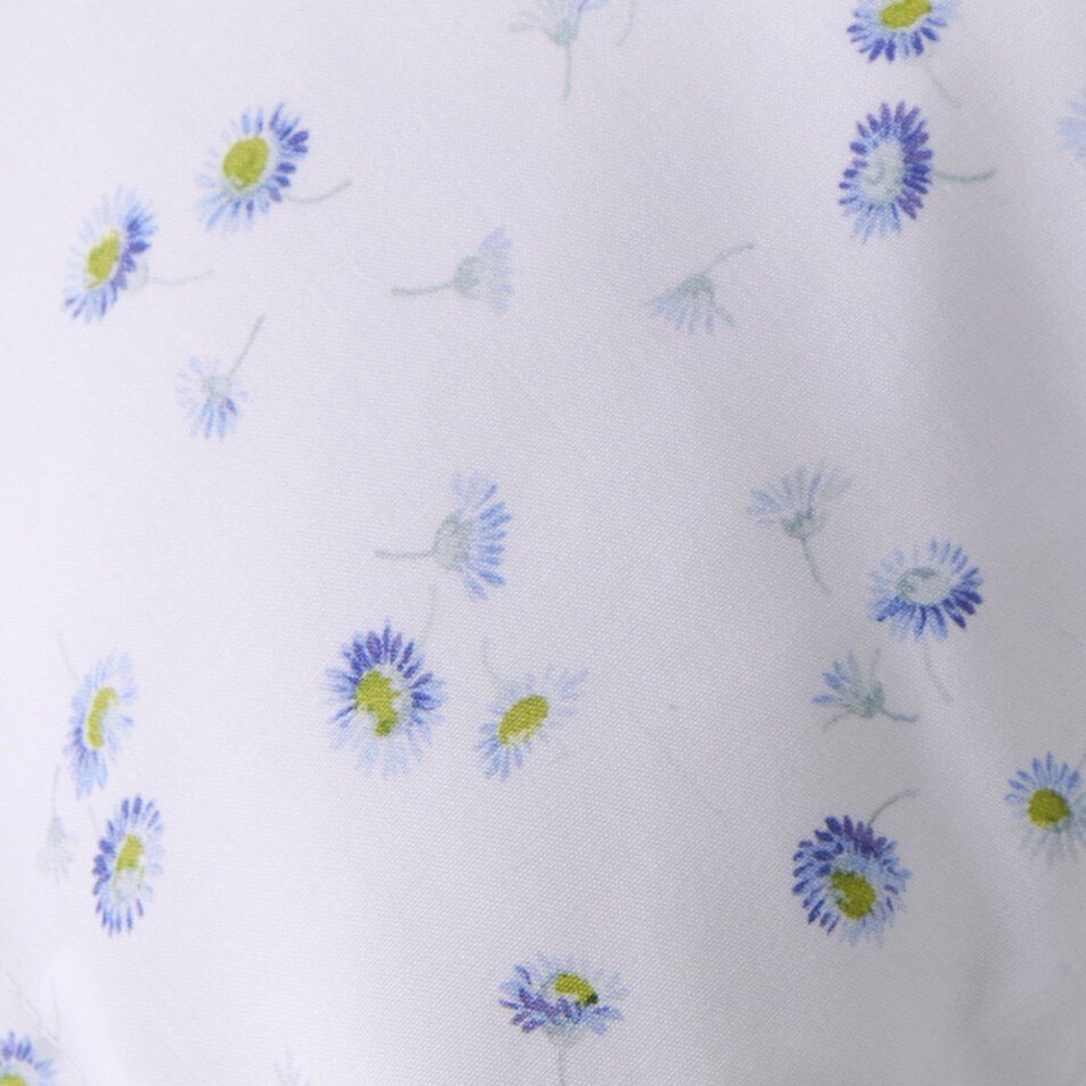 Stamattina's Margherita is a sweet print of tiny flowers of greens and blues. Printed and finished in Italy Constructed in USA. Colors of print on white background.