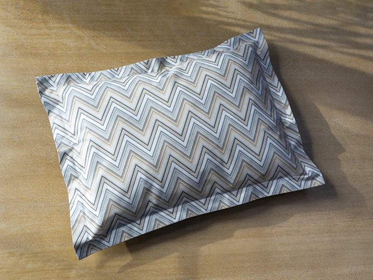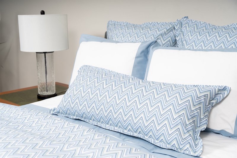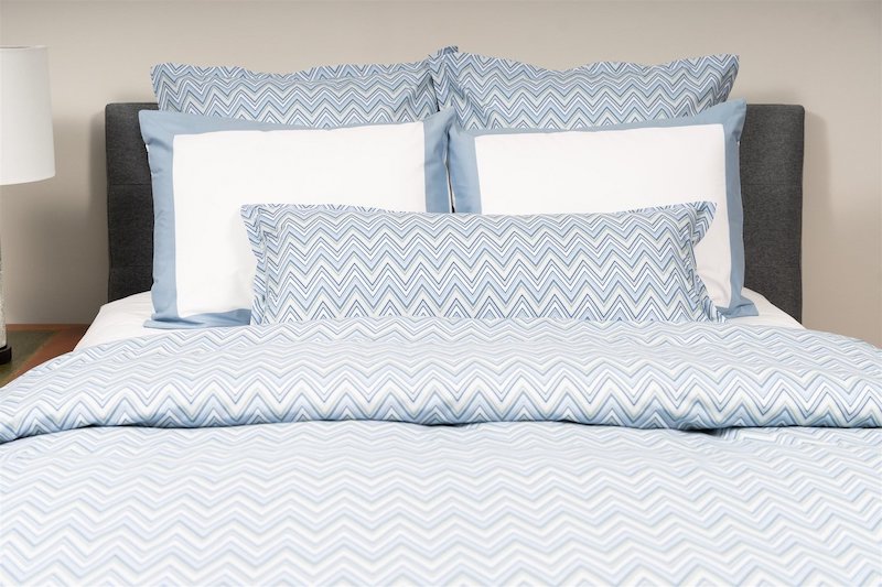 Stamattina's Matteo has a contemporary and stylish chevron design. Blue/Sea Glass colors on white background. Shams have a 1” flange. The duvet covers are self reversing. Plain hem. Printed and finished in Spain and constructed in USA.