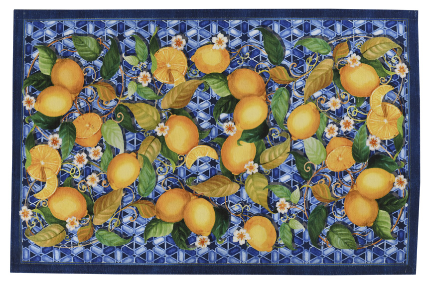Sevillana's design is pure sunshine. Plump lemons and vines are all lounging on beautiful bright blue tile patchwork. This rug is perfect for those warm and sunny summer days. Tip Tapp Rugs by Tessitura Toscana Telerie are great indoor/outdoor rugs. You can spruce up any space with these rugs. Whether it is your kitchen, entryway, bathroom or porch they will bring some color and flair. Due to its small grips on the bottom side your rug will be stable and be non-slip. Machine washable. Rugs come in a recycled polyester case. 80% recycled polyester 20% polyester.