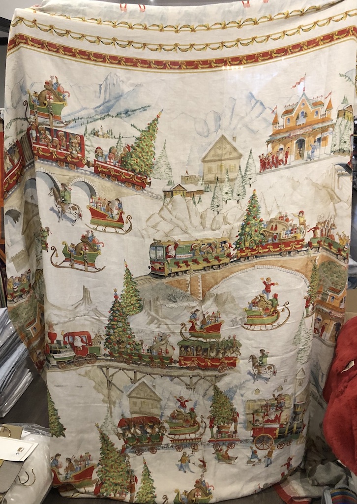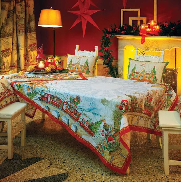 Tessitura Toscana Telerie is a wonderful linen company that makes all their products in Tuscany, Italy. Printed on 100% linen. Christmas Express shows Santa and his sleigh on trains' along with Christmas trees.