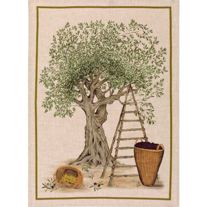 D.O.P. -- which means Denominazione di Origine Protetta (or Protected Origin Destination) has been applied to this olive tree shown during harvest. This style is also available in a table runner and tablecloths. Printed on a natural colored linen with a green border all around.