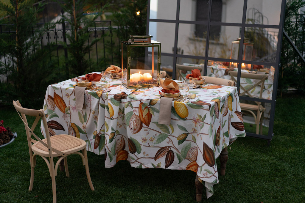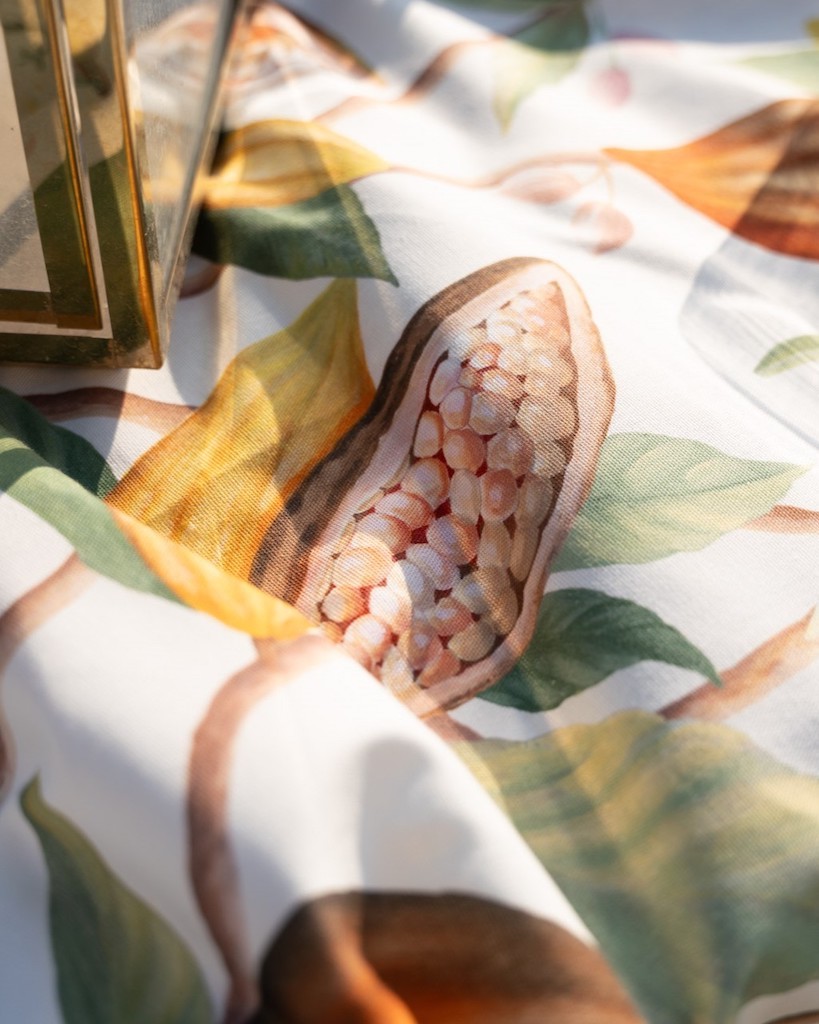 Tessitura Toscana Telerie is a wonderful linen company that produces their designs in Tuscany, Italy. Cocoa table linens have an imaginary cocoa plantation. The natural elegance of the tree and its precious fruits gives a touch of style and modernity to your dining room. Works with formal china or can be scaled down to a casual look. Printed on 100% cotton. We are proud to import their products for the US market.