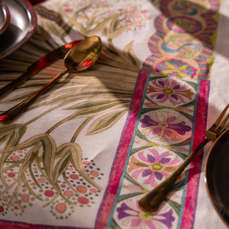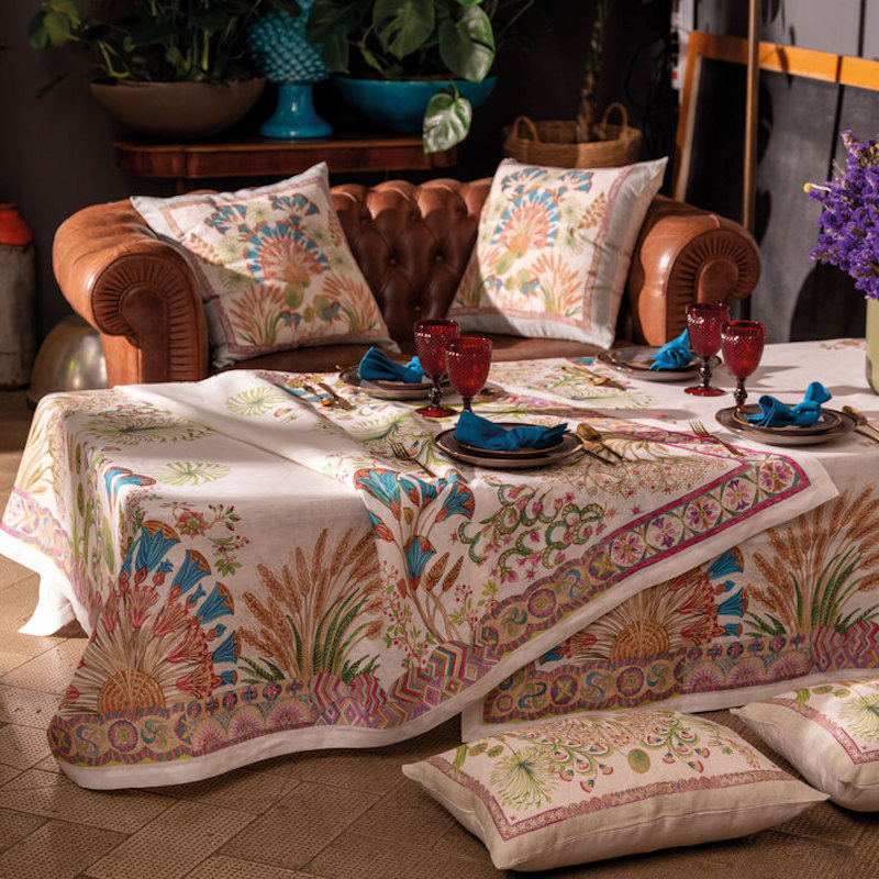 Tessitura Toscana Telerie is a wonderful linen company that makes all their products in Tuscany, Italy. Papyro has an exotic feel to it. The design has plants and flowers from far away lands in rich jewel tones. Works with formal china or can be scaled down to a casual look. Runners are engineered. Tablecloth have self hem finish and mitered corners. Printed on 100% linen.