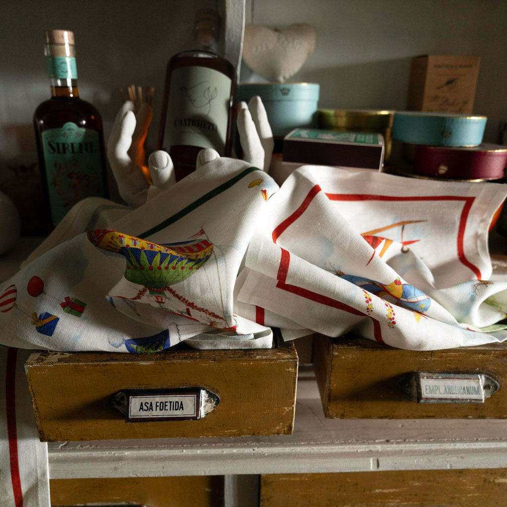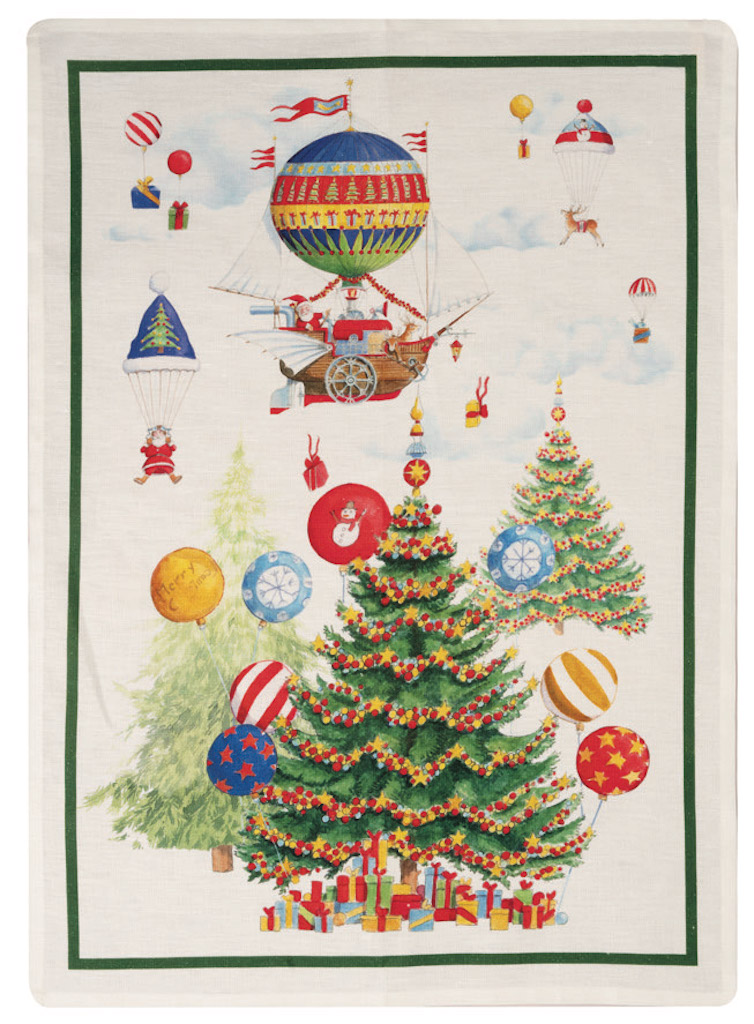 Tessitura Toscana Telerie is a wonderful linen company that makes all their products in Tuscany, Italy. Their kitchen towels are so pretty they could be wall art but strong enough for regular use. Air Christmas Green is no exception. The design is of three magical Christmas trees all decorated for the season. Above those trees are all sorts of splendid balloons. Use in your kitchen or place in your powder room as they are perfect as a hand towel. 100% linen, they're perfect for lint-free drying. Made in Italy.