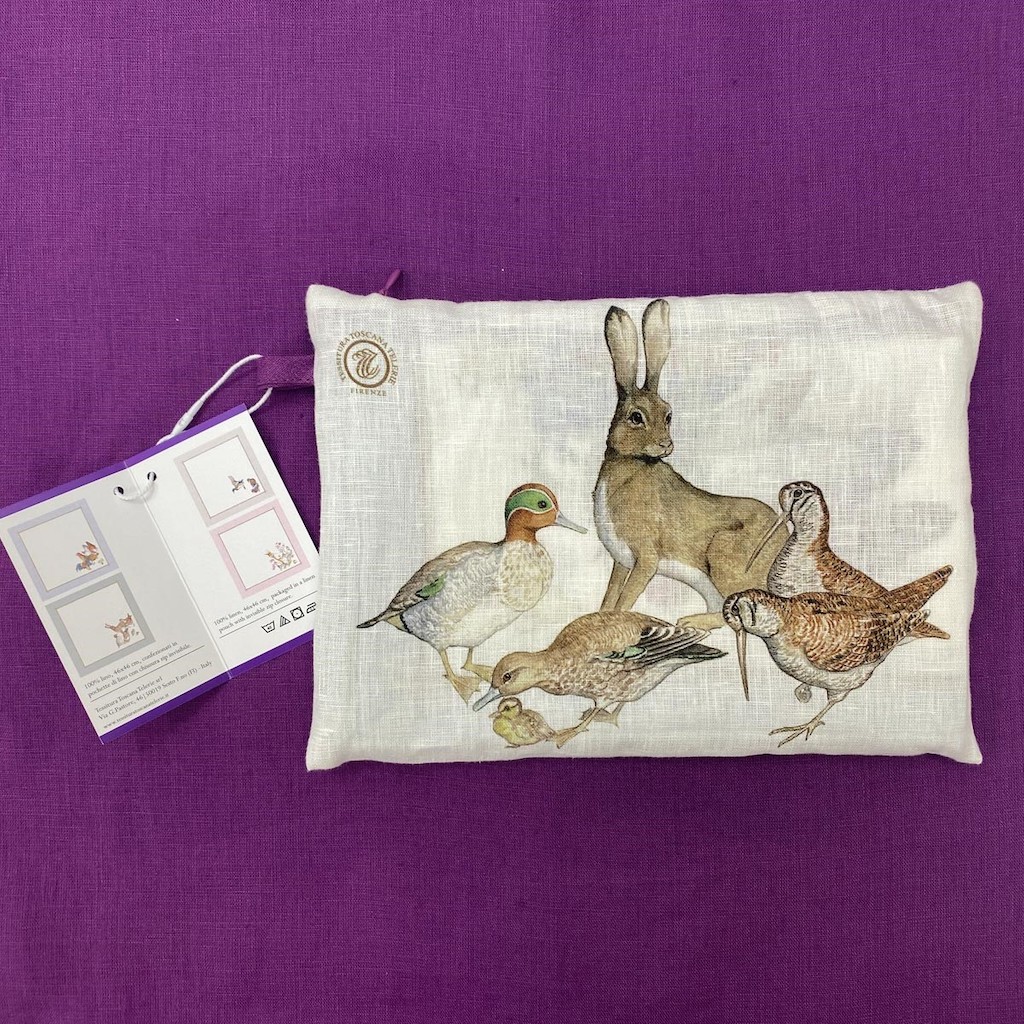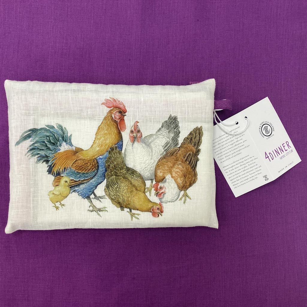 Tessitura Toscana Telerie Barn Friends Dinner Napkins are so sweet and versatile. Each four-piece set features 4 different subjects designed with the usual refinement, taste and artistic flair of Tessitura Toscana Telerie. In this set you will find chickens, rabbits and ducks. A true barnyard scene. These napkins are for those who love beauty in everyday life. Simple hem with mitered corners. 100% linen. Made in Italy.