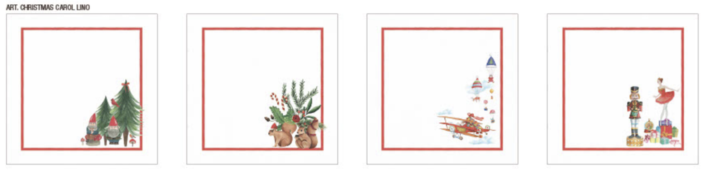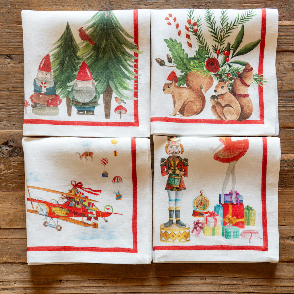 Tessitura Toscana Telerie Christmas Carol Dinner Napkins are gorgeous and perfect for the holidays. Each four-piece set features 4 different subjects designed with the usual refinement, taste and artistic flair of Tessitura Toscana Telerie. In this set you will find jolly elves, darling squirrels, Santa and nutcracker characters. These napkins are for those who love beauty in everyday life. Simple hem with mitered corners. 100% Linen. Made in Italy. Items packed in bags made of the same fabric as the product. We are proud to import their products for the US market.