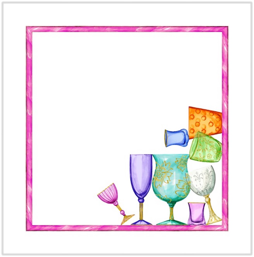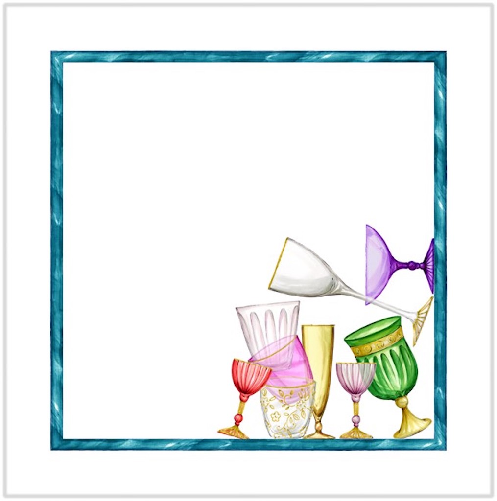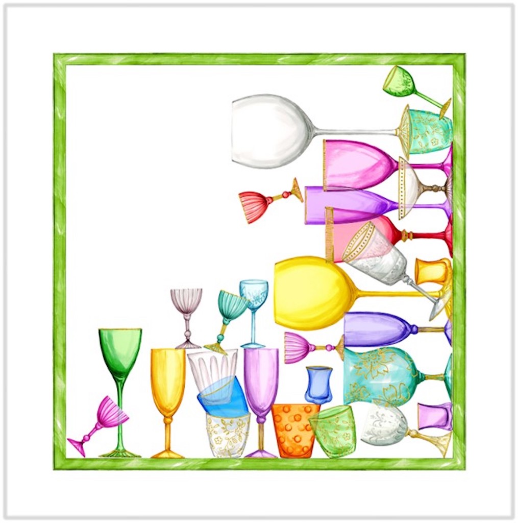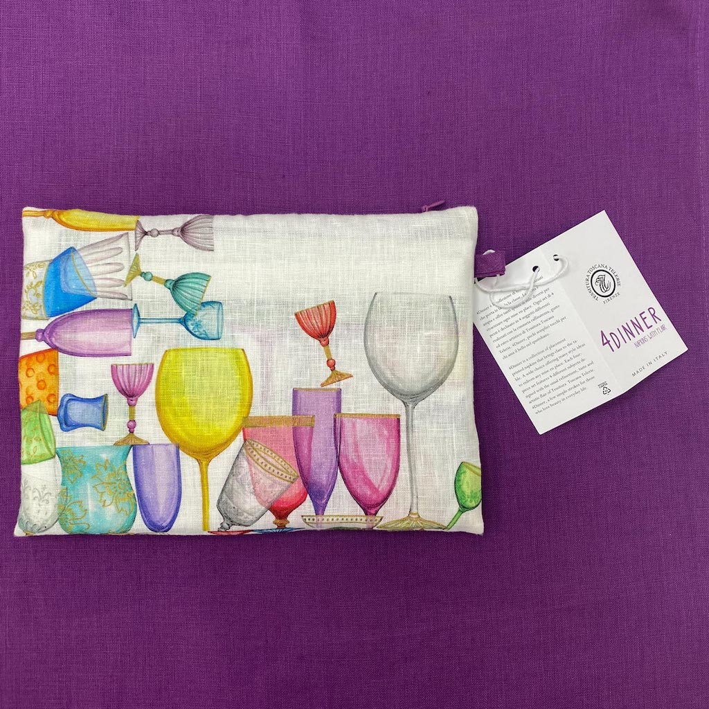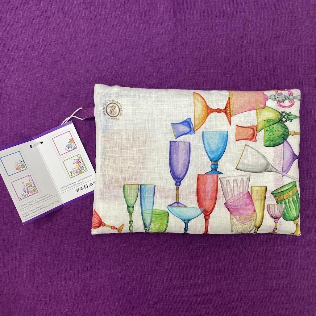 Tessitura Toscana Telerie Cine Cin Dinner Napkins are so sweet and delicious. Each four-piece set features 4 different subjects designed with the usual refinement, taste and artistic flair of Tessitura Toscana Telerie. In this set you will find colorful glassware. These napkins are for those who love beauty in everyday life. Simple hem with mitered corners. 100% linen. Made in Italy.
