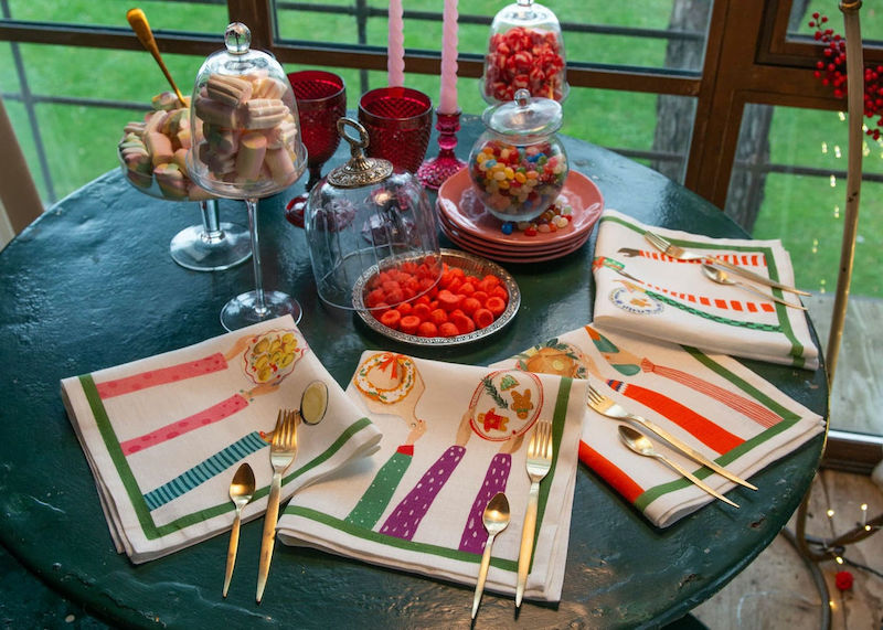 Tessitura Toscana Telerie Hand On Xmas Dinner Napkins are brightly colored and perfect for your Christmas Table. Each four-piece set features 4 different subjects designed with the usual refinement, taste and artistic flair of Tessitura Toscana Telerie. In this set you will find fun hands displaying favorite dishes. These napkins are for those who love beauty in everyday life. Simple hem with mitered corners. 100% linen blend. Made in Italy.