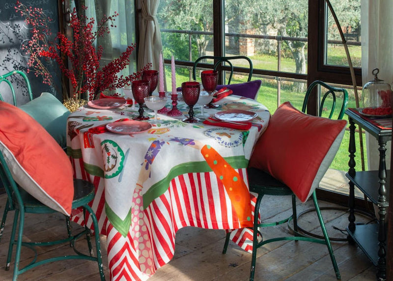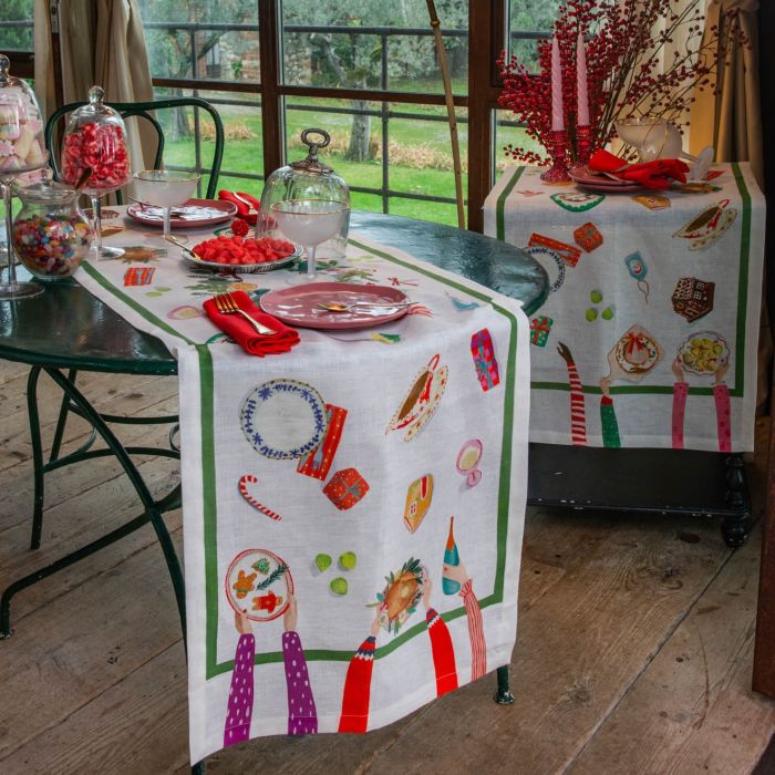 Tessitura Toscana Telerie is a wonderful linen company that produces their designs in Tuscany, Italy. Hand On Xmas is designed to showcase a fabulous and festive Christmas Dinner. Engineered Linen and Cotton Blend. Made in Italy.