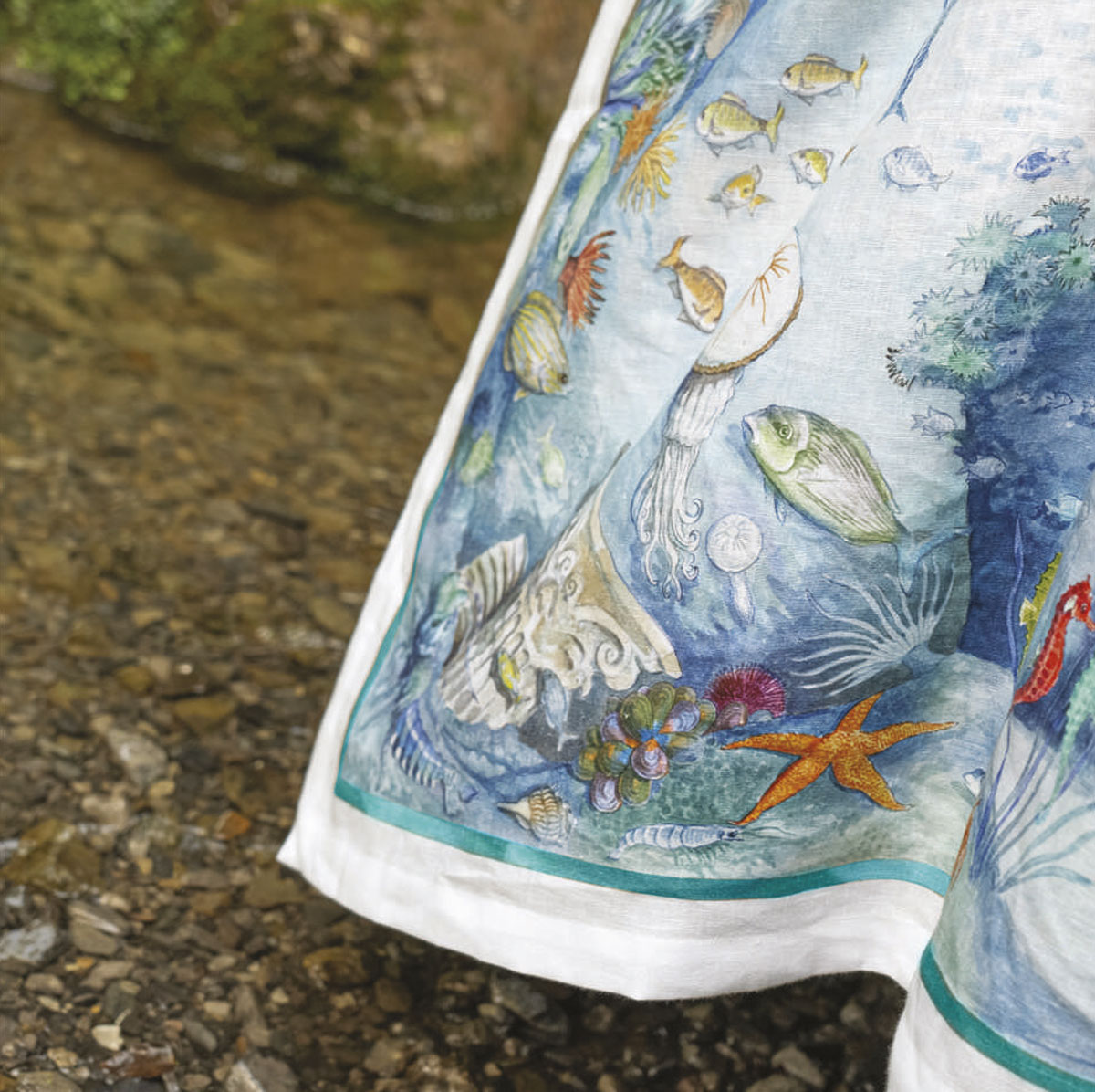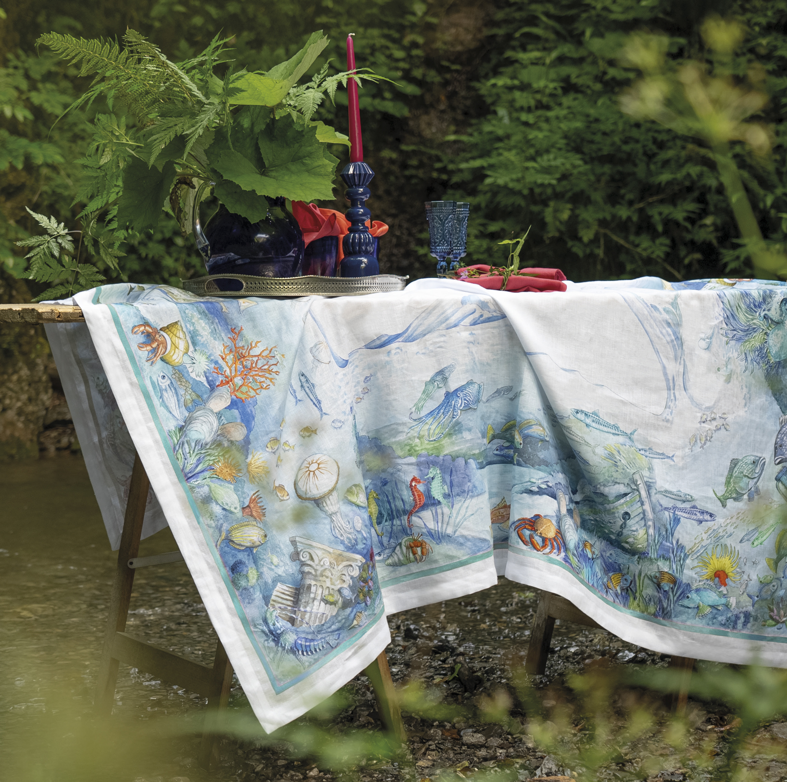Tessitura Toscana Telerie is a wonderful linen company that makes all their products in Tuscany, Italy. Isuela is pure ocean bliss. The design has habitants and treasures of the sea. Works with formal china or can be scaled down to a casual look. Runners are engineered. Tablecloth have self hem finish and mitered corners.