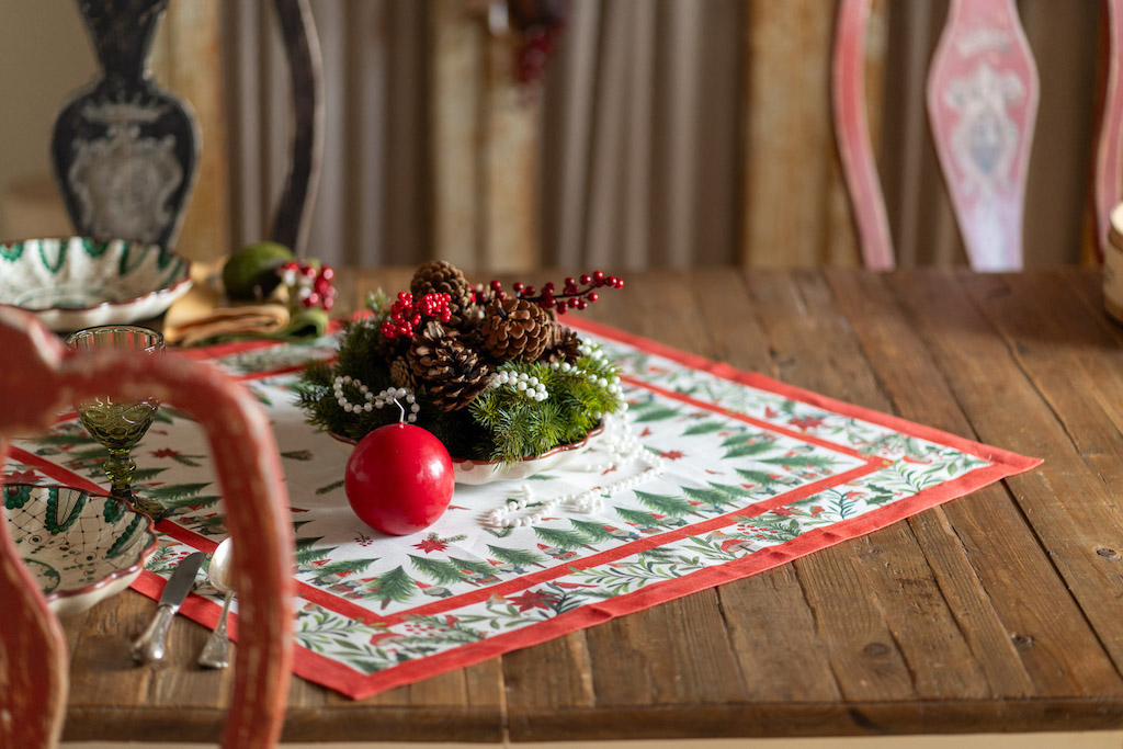 Tessitura Toscana Telerie is a wonderful linen company that makes all their products in Tuscany, Italy. Jolly Elf's design consists of adorable bearded elves surrounded by pine trees, birds and seasonal greenery. Runners are engineered. Tablecloth have self hem finish and mitered corners. Printed on 100% linen. We are proud to import their products for the US market.