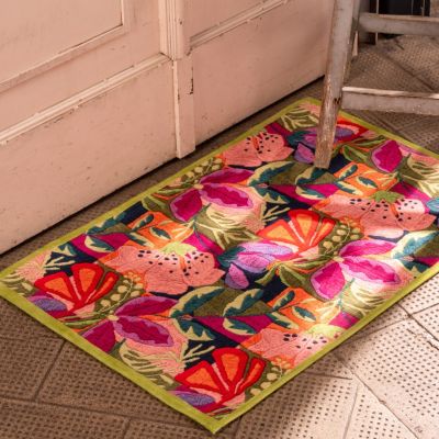 Tip Tapp Rugs by Tessitura Toscana Telerie are great indoor/outdoor rugs. You can spruce up any space with these rugs. Whether it is your kitchen, entryway, bathroom or porch they will bring some color and flair. Kiriku's design is full of bright and rich florals that can enliven any floor. Due to its small grips on the bottom side your rug will be stable and be non-slip. Machine washable. Rugs come in a recycled polyester case. 80% recycled polyester 20% polyester.