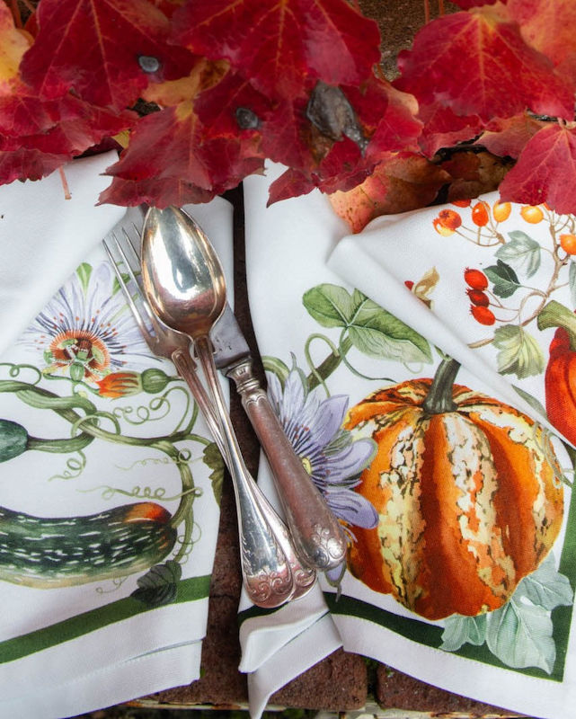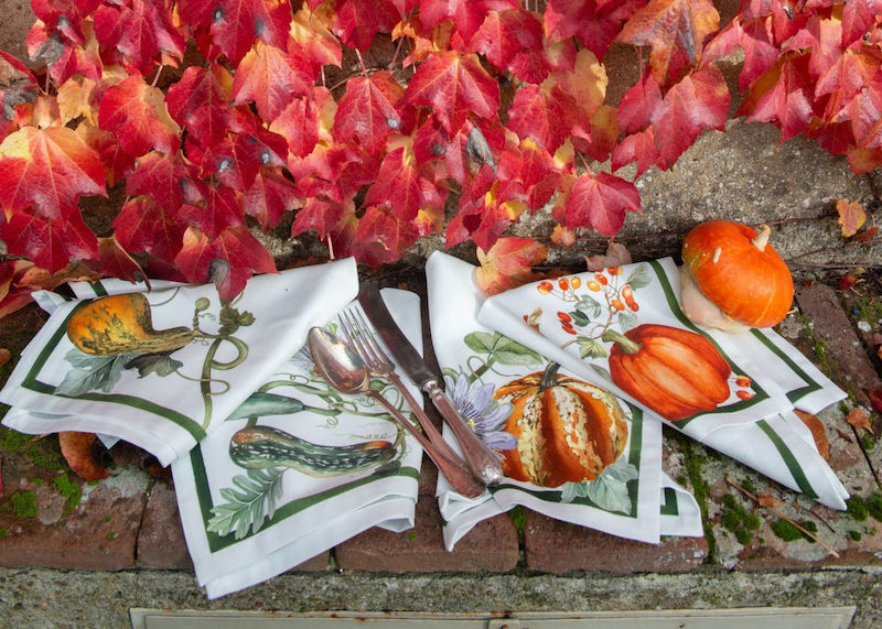 Tessitura Toscana Telerie Kurbis Dinner Napkins are beautifully colored and perfect for your Fall Table. Each four-piece set features 4 different subjects designed with the usual refinement, taste and artistic flair of Tessitura Toscana Telerie. In this set you will find wonderful fall squash. These napkins are for those who love beauty in everyday life. Simple hem with mitered corners. 100% cotton. Made in Italy.