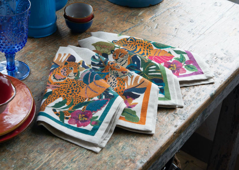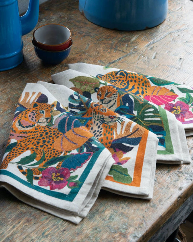 Tessitura Toscana Telerie Leoleaf Dinner Napkins are stunning and perfect for your Table. Each four-piece set features 4 different subjects designed with the usual refinement, taste and artistic flair of Tessitura Toscana Telerie. In this set you will find bright jewel tones with leopards and tropical flora. These napkins are for those who love beauty in everyday life. Simple hem with mitered corners. 100% linen blend. Made in Italy.
