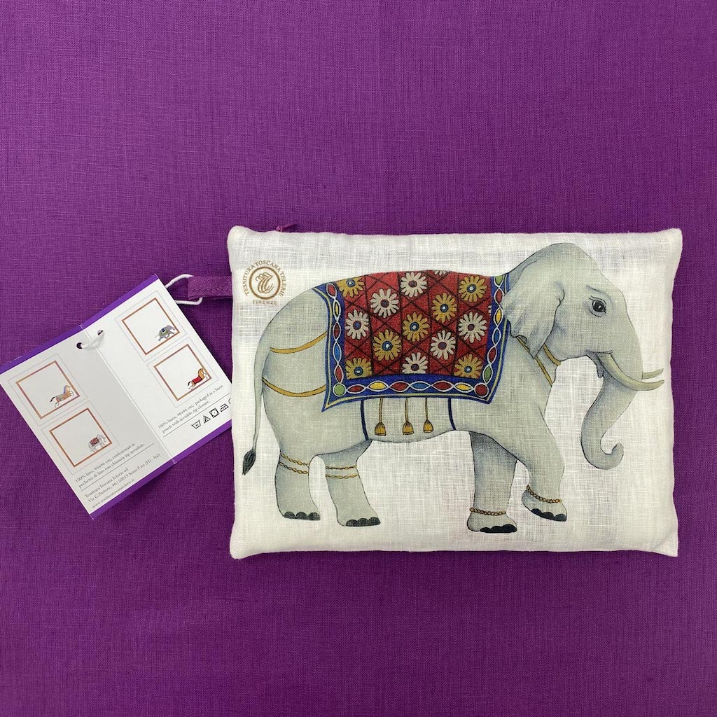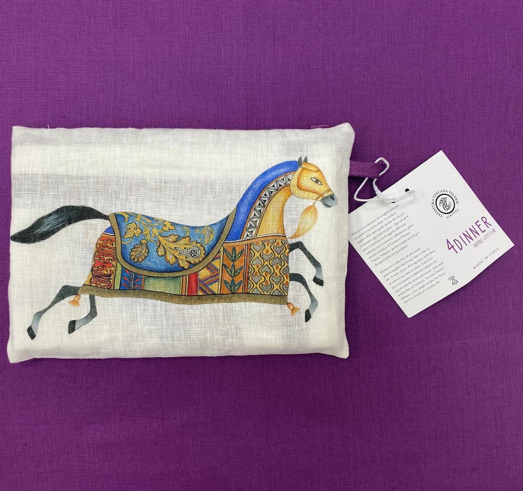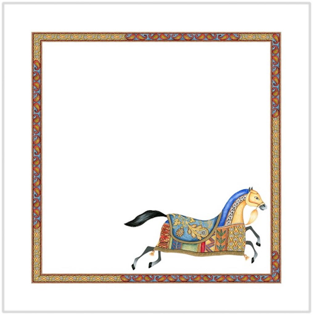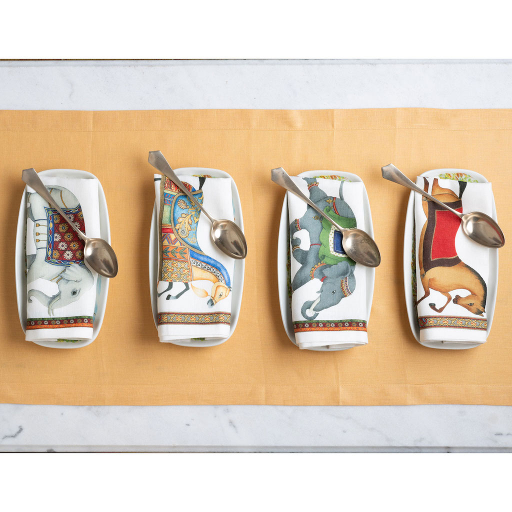Tessitura Toscana Telerie Maharajah Dinner Napkins are bright and captivating. Each four-piece set features 4 different subjects designed with the usual refinement, taste and artistic flair of Tessitura Toscana Telerie. In this set you will find a variety of animals to be thought to be royalty. In Sanskrit it stands for a "great ruler", "great king" or "high king". These napkins are for those who love beauty in everyday life. Simple hem with mitered corners. 100% linen. Made in Italy.