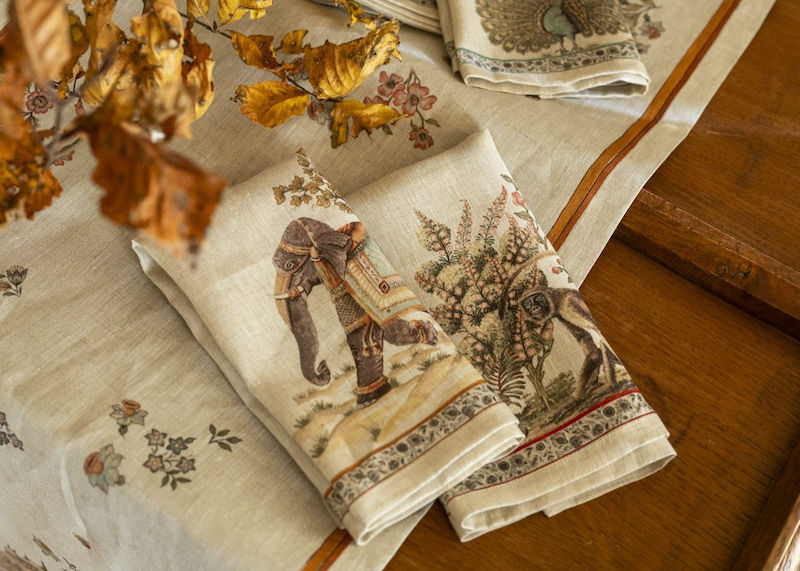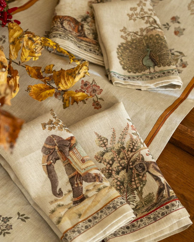 Tessitura Toscana Telerie Mudra Dinner Napkins are exotic and perfect for your next dinner Table. Each four-piece set features 4 different subjects designed with the usual refinement, taste and artistic flair of Tessitura Toscana Telerie. In this set you will find elaborately decorated wild animals. These napkins are for those who love beauty in everyday life. Simple hem with mitered corners. 100% linen. Made in Italy.