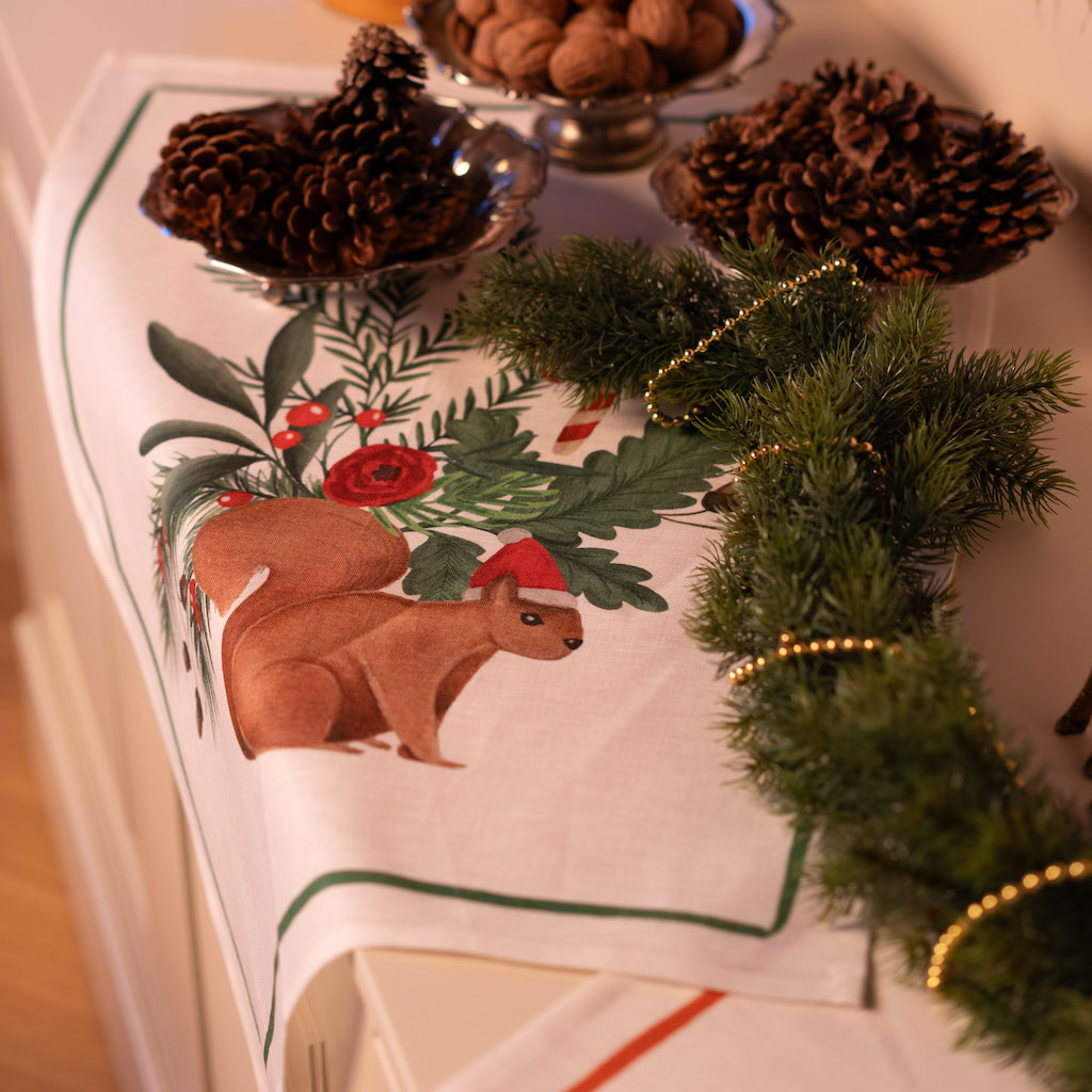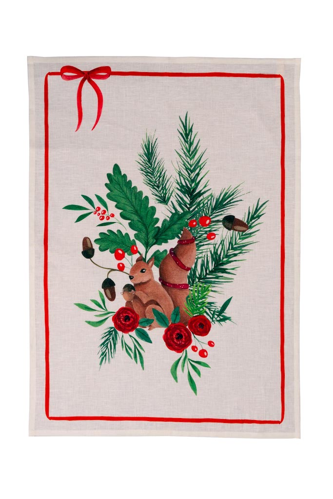 Tessitura Toscana Telerie is a wonderful linen company that makes all their products in Tuscany, Italy. Their kitchen towels are so pretty they could be wall art but strong enough for regular use. Nutnook Red is no exception. The design is of a lovable squirrel who decorated his tail with red garland. He is then embellished with Christmas greenery and acorns. The border on this towel is finished with a red bow. Use in your kitchen or place in your powder room as they are perfect as a hand towel. 100% linen, they're perfect for lint-free drying. Made in Italy.