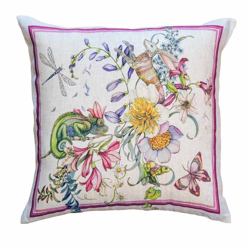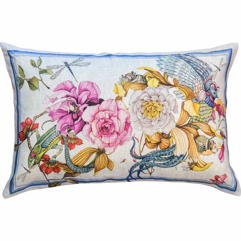 Tessitura Toscana Telerie is a wonderful linen company that designs and manufacturers all their products in Tuscany, Italy. Their decorative pillows are just stunning. Semiramide is magical. Wondrous animals, creatures and flowers all living together in harmony. This collection is colorful and fanciful. 100% linen.