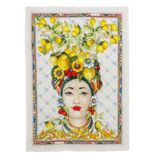 Inspired by the fragrant orange blossoms of Sicily, the Zagara Kitchen Towel Donna features an elegant illustration of a woman adorned with a headdress of vibrant citrus fruit. Tessitura Toscana Telerie kitchen towels are constructed from pure linen, this towel combines practical durability with sophisticated design. An ideal selection for discerning homeowners seeking linens that seamlessly merge functionality with refined aesthetic appeal.