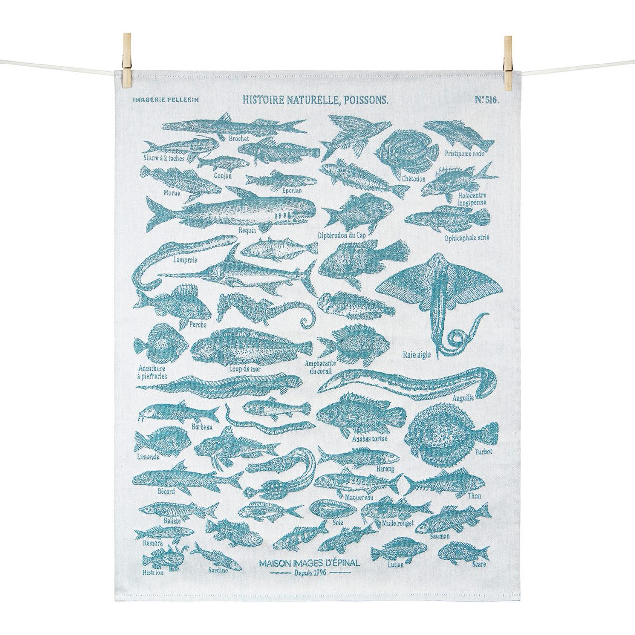 Tissage Moutet's Histoire Naturelle - Poissons tea towel is a design from The Imagerie D’Epinal. It is the most famous imagery and the last still active in the world. From the 18th to the 20th century, imageries played a major role in the transmission of popular knowledge, spreading their illustrated sheets throughout Europe. Also in the collection Poissons and Oiseaux. 100% cotton.