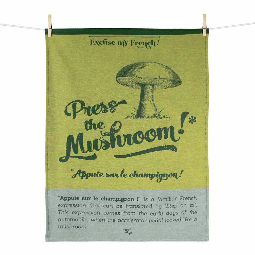 Tissage Moutet's Mushroom tea towel was produced in collaboration with Atelier Letterpress, humorously illustrates the word-for-word translation of the French expression "Appuie sur le Champignon!”. Meaning Step on It!! In the early days of the auto the pedals looked like mushrooms. With its vintage engraving, this quirky tea towel will put everybody in a good mood! Designed, woven and sewn in our workshop in Orthez, in the south-west of France. 100% Cotton. Size: 20″ x 28″ inches.