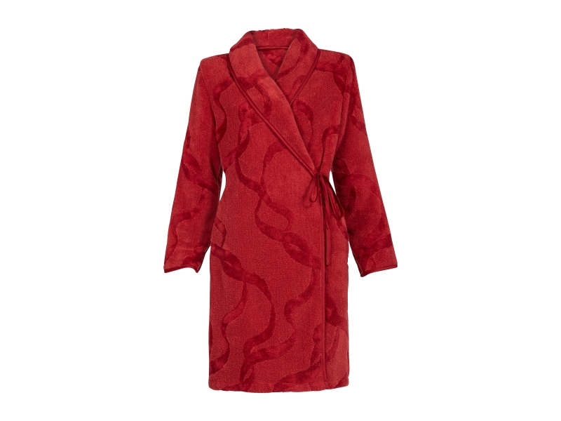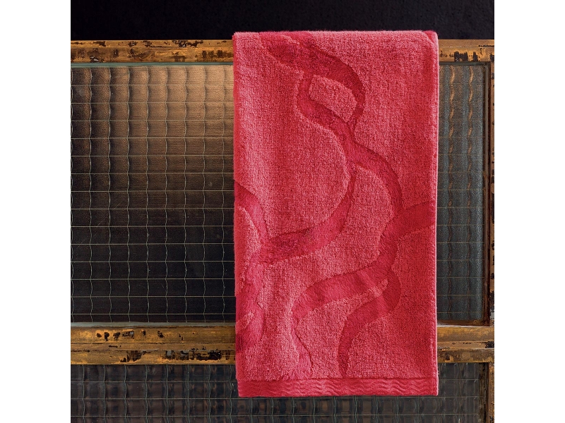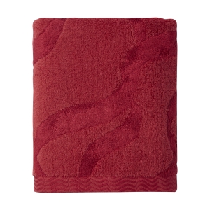 A jacquard woven opera red bath towel, Penelope is finished with a small dobby border.