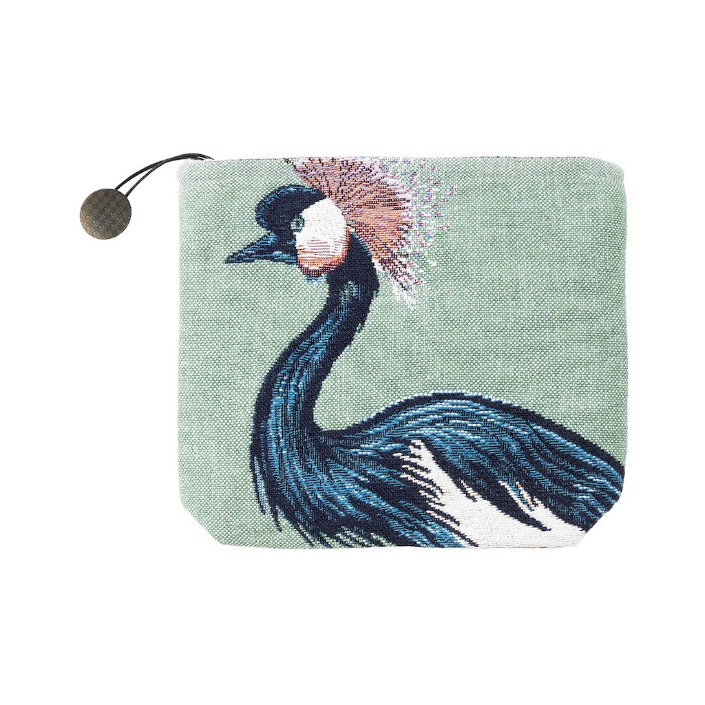 Yves Delorme's Altesses Totes in Celadon reveal a majestic crowned crane, adorned with a feathered tiara, on a soft background. Made in Belgium.