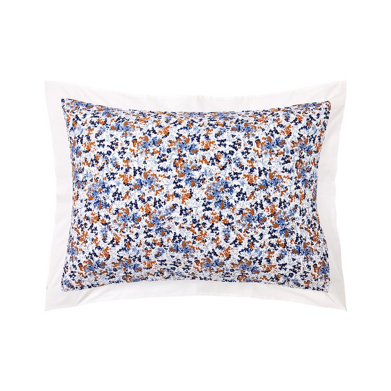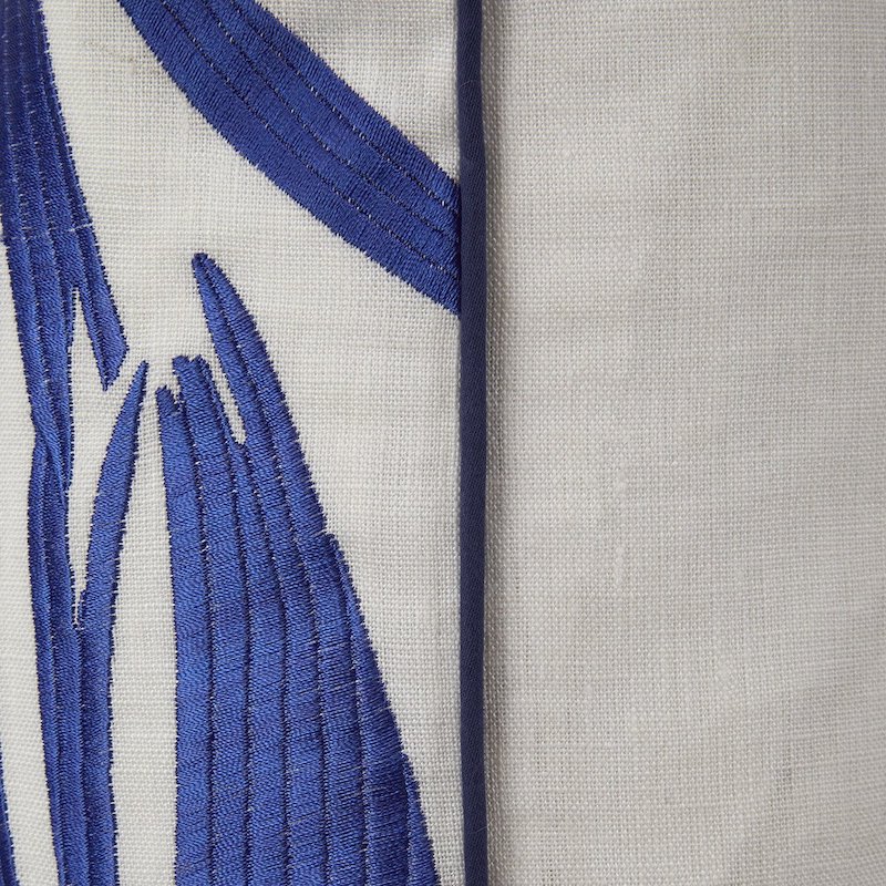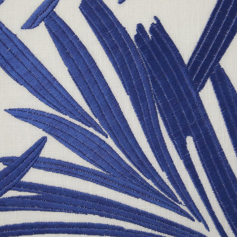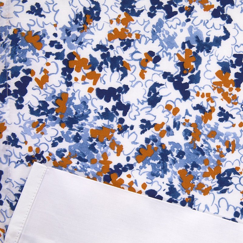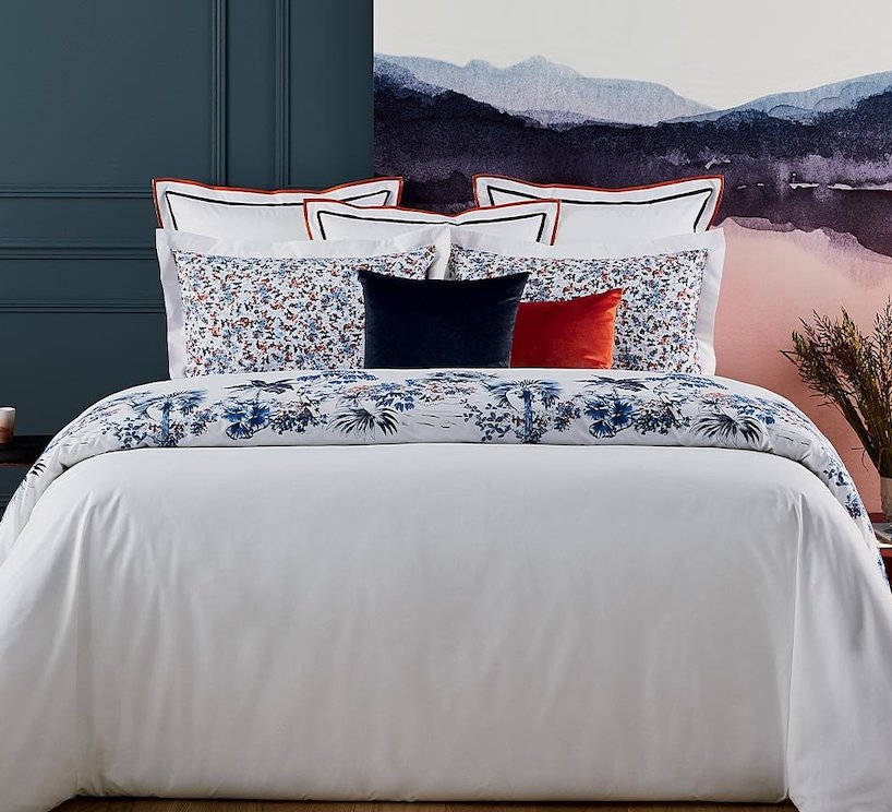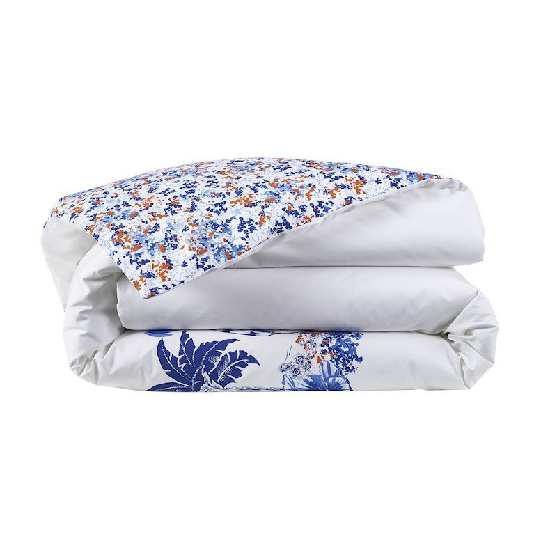 Yves Delorme's Baie Bedding is a uniquely designed tropical jungle print and is a limited edition. A liberty like all over pattern appears on the shams, flat, fitted and reverse of the duvet. A large engineered border of tropical trees centers on a white background on the duvet. The look makes for rich and spectacular landscape. Several shades of blue and orange coral make up the prints. The shams and the flat sheet have a 2.5 inch double sided white border. The quilt is the all over pattern on both sides. Coordinates with the new 2021 Dyade pattern -- shown in the main photo as the euros.