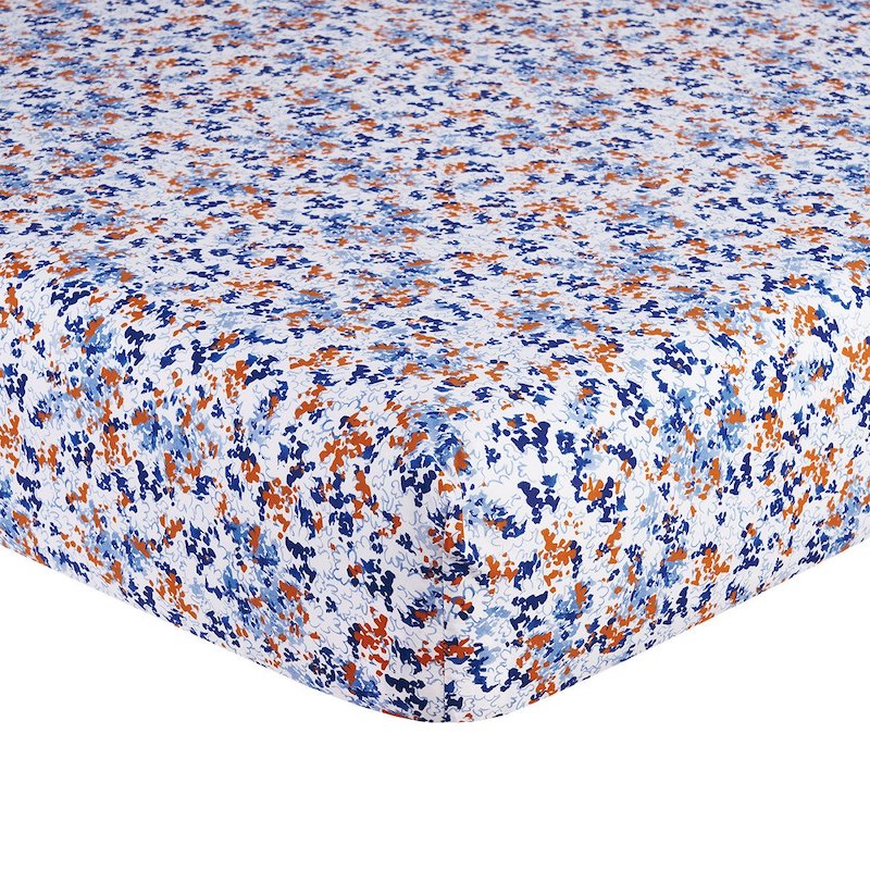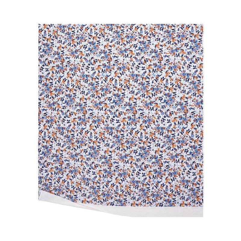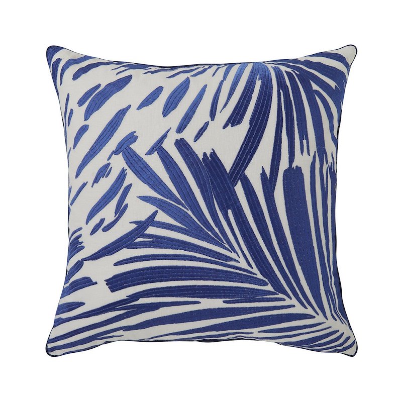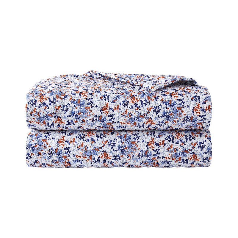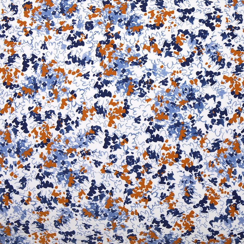 Yves Delorme's Baie Bedding is a uniquely designed tropical jungle print and is a limited edition. A liberty like all over pattern appears on the shams, flat, fitted and reverse of the duvet. A large engineered border of tropical trees centers on a white background on the duvet. The look makes for rich and spectacular landscape. Several shades of blue and orange coral make up the prints. The shams and the flat sheet have a 2.5 inch double sided white border. The quilt is the all over pattern on both sides. Coordinates with the new 2021 Dyade pattern -- shown in the main photo as the euros.