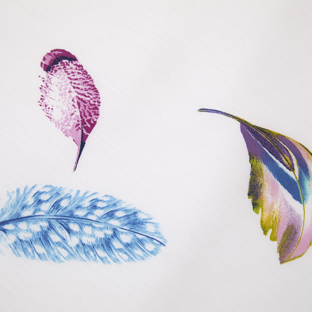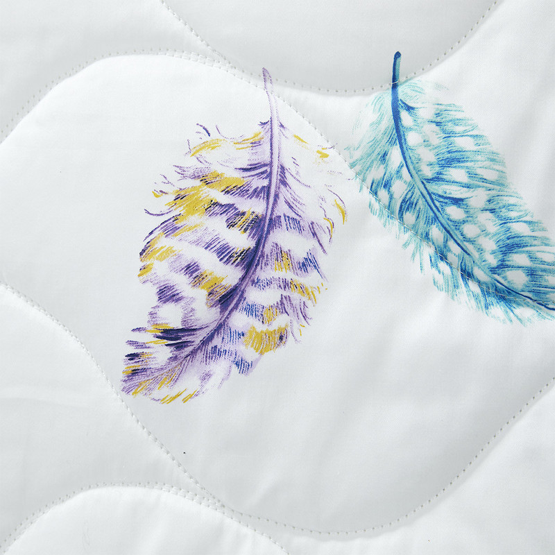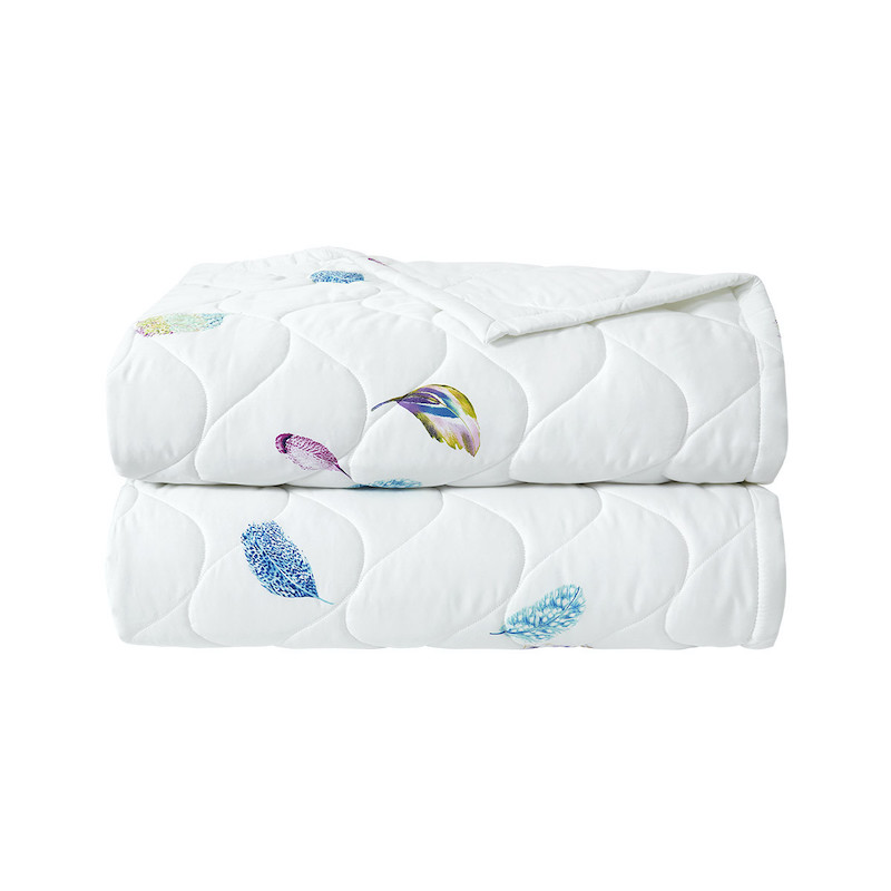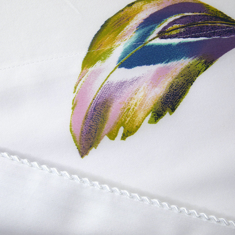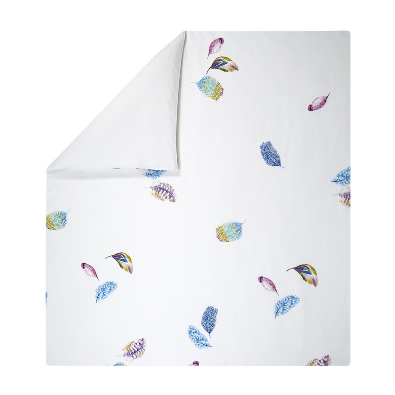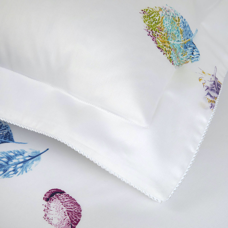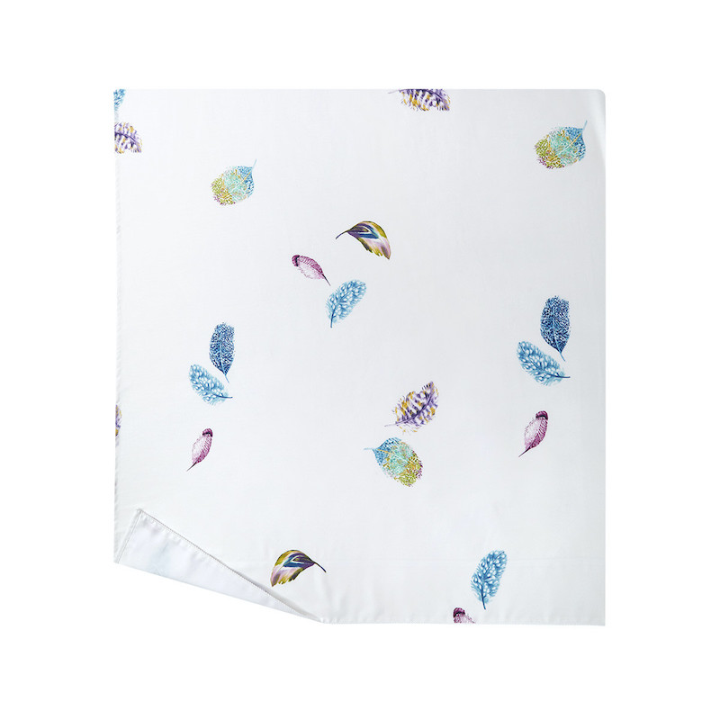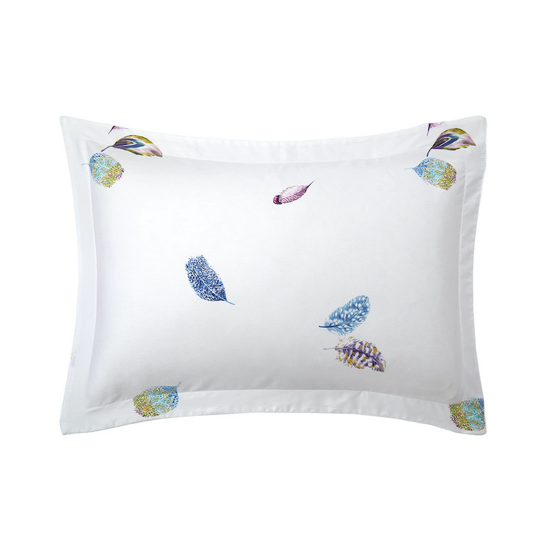 Yves Delorme's Celeste Bedding Collection is fresh and light. Beautiful feathers of stunning jewel tones are scattered about on crisp white cotton sateen. You can choose to keep it light and pure or add more jewel tone accents to make a statement in you room. Printed on 300 TC long staple combed organic cotton. We recommend using Triomphe fitted sheets in Blanc or Marine. Made in France.