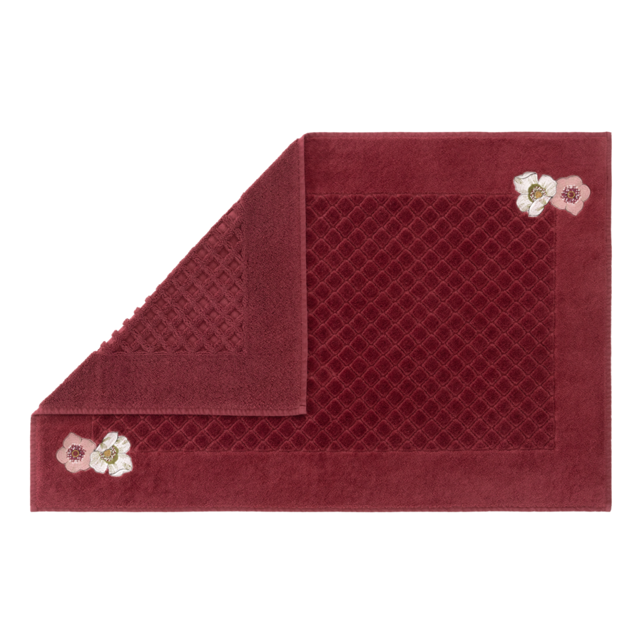 Bath mat is solid terry with embroidered flowers in the corner, 850 gsm.