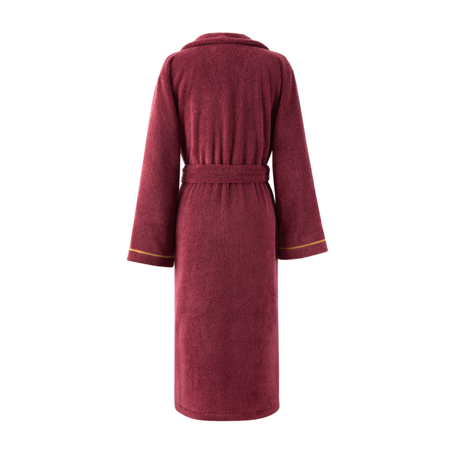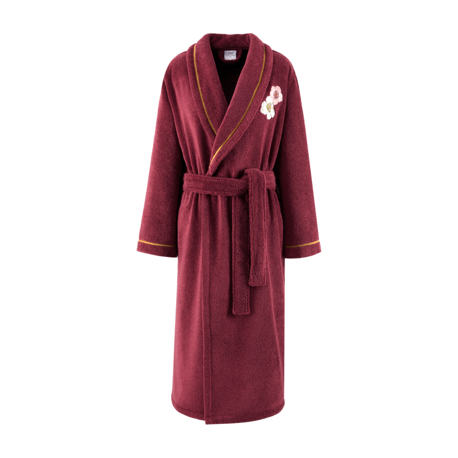 Shawl collar bathrobe with bourdon finish, embroidery on chest.