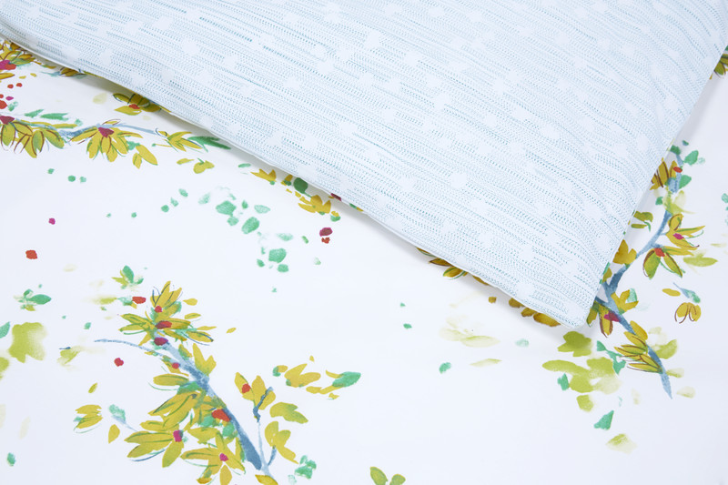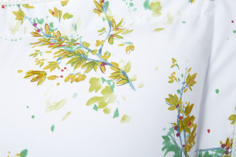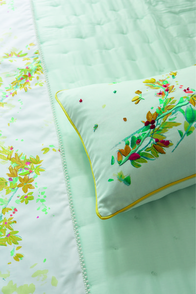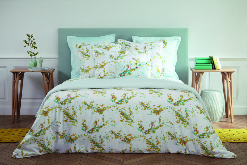 Jasmine blossoms in chartreuse, fuschia and turquoise are printed on classic Yves Delorme percale. Indicative of spring, and one of the first plants to blossom after winter, Lucine will wake up any bedroom. Reverses to a jade and white striped like print that is also on the fitted sheet. Finished on the sheets and shams with a white french knot like trim. Quilt reverses from jasmine print to jade print.