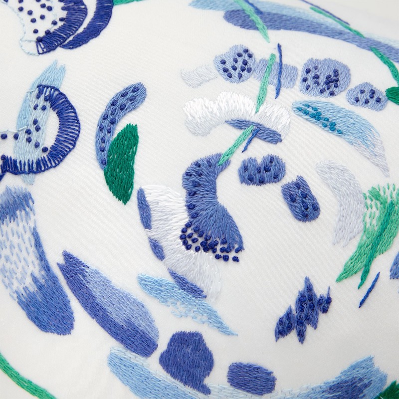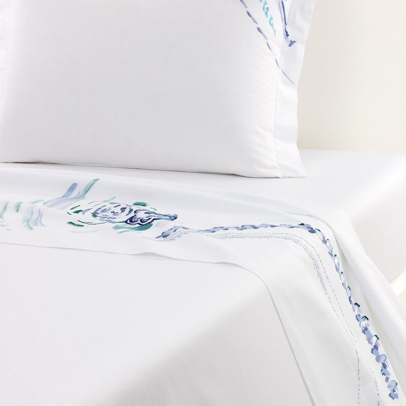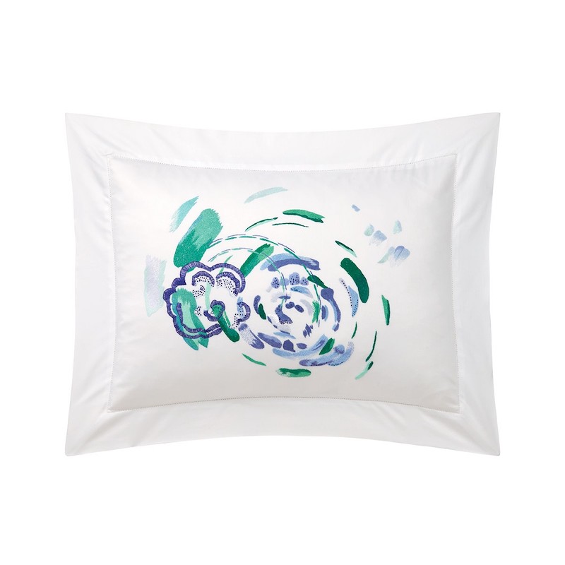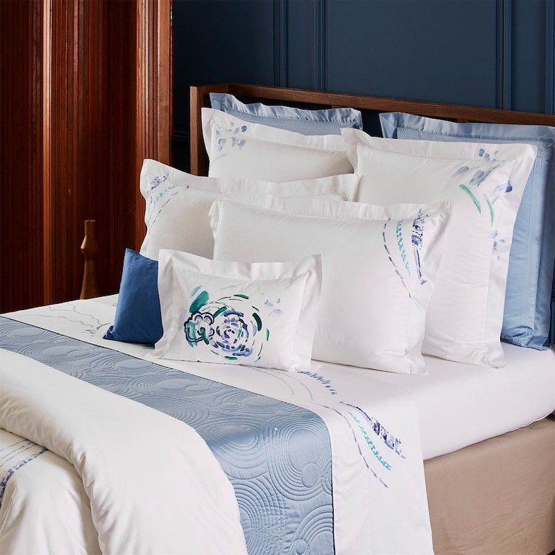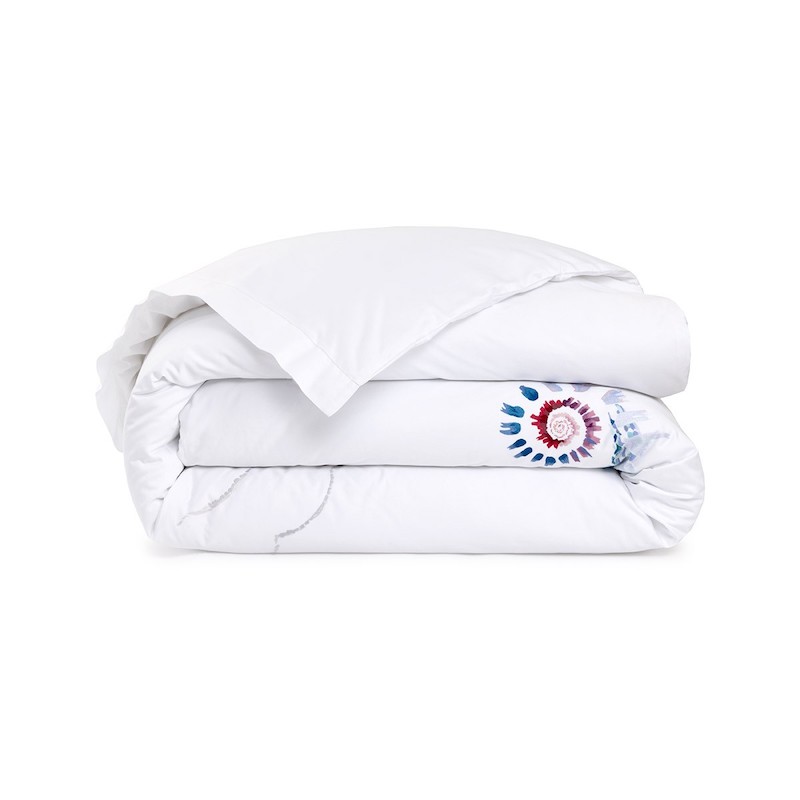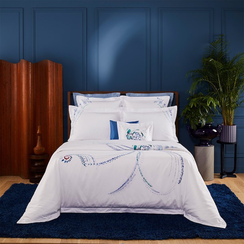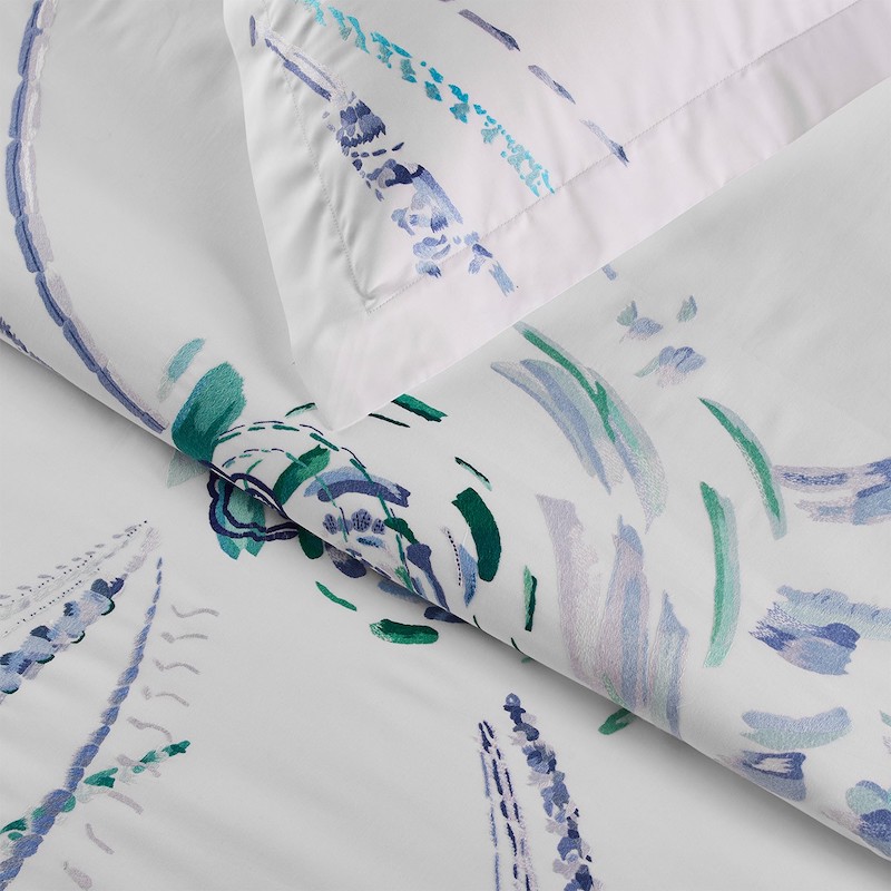 Abysses is part of the Yves Delorme Couture collection. Inspired by the unique handwriting of painter FrantiĊĦek Kupka, this set reinvents the imaginary abyss. Hand-embroidered with remarkable precision, it blends stitches, threads and colors in a captivating interplay, transforming your bed into a unique and vibrant work of art. Sham with a 2-inch flange, hand embroidered design. Duvet cover with a 2-in flange, hand-embroidered and placed design, button closure. Flat sheet with 5-inch hem, hand-embroidered and placed design, tailored corners. Use Adagio Fitted Sheet in the color Blanc.