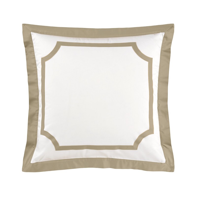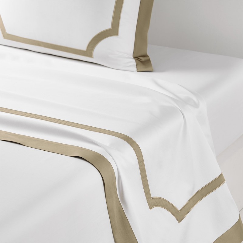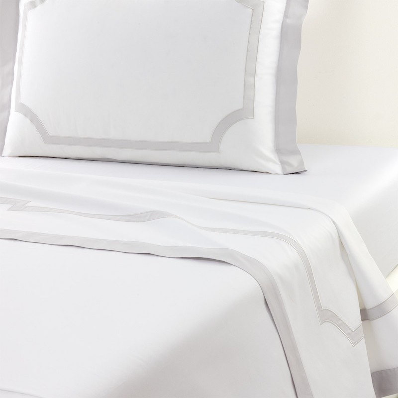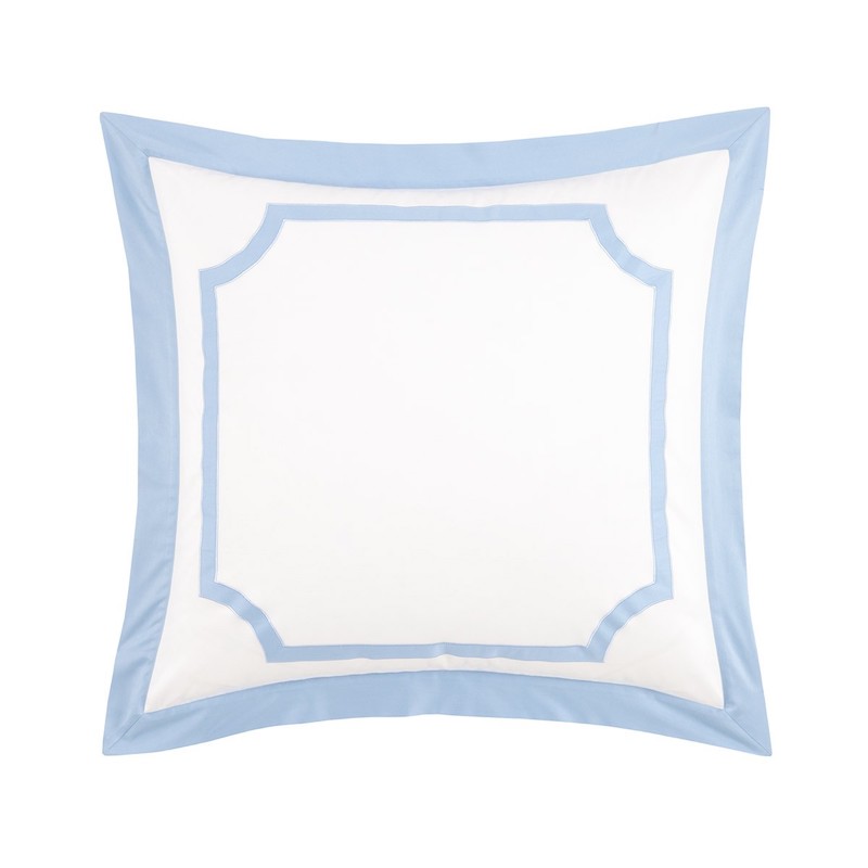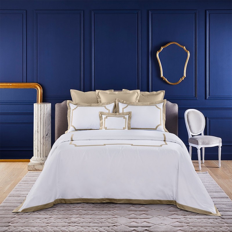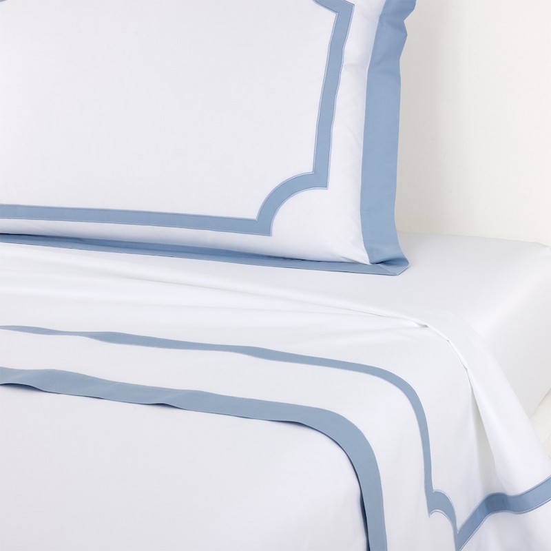 Haussmann is part of the Yves Delorme Couture collection. Parisians owe the elegance of their city to the Baron Haussmann. The emblematic décor of these interiors are evoked by contrasting cotton sateen appliqués. Drawing on decorative architectural elements, the design is crafted from 100% Supima cotton sateen in white and adorned with contrasting appliques and linear embroidery in a few color choices. Shams feature 2” flange and point nervure finish, envelope closure. Duvet cover features applied band and colored flanges, button closure. Flat Sheet features applied band and flange. 100% long staple combed organic cotton sateen, 500 thread count. Created in France and made in our partner workshops in Portugal.