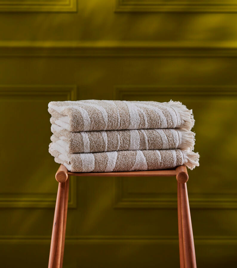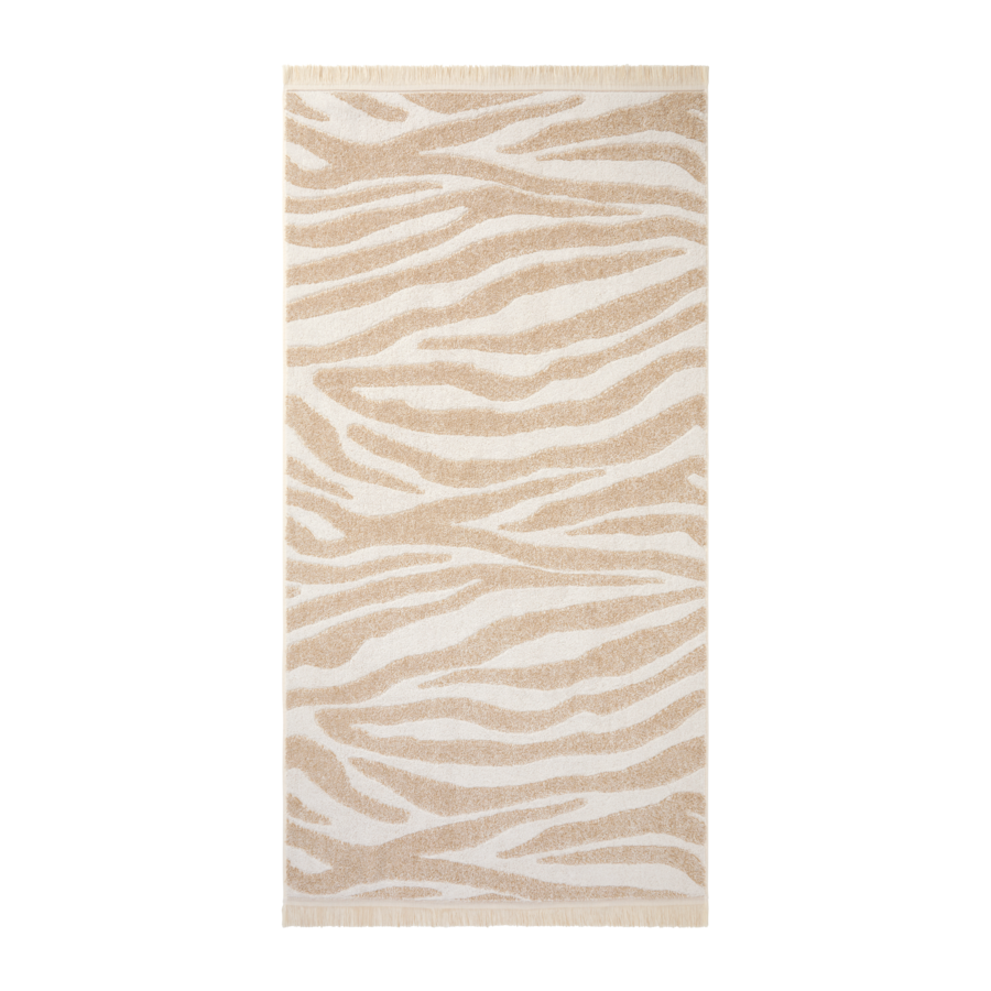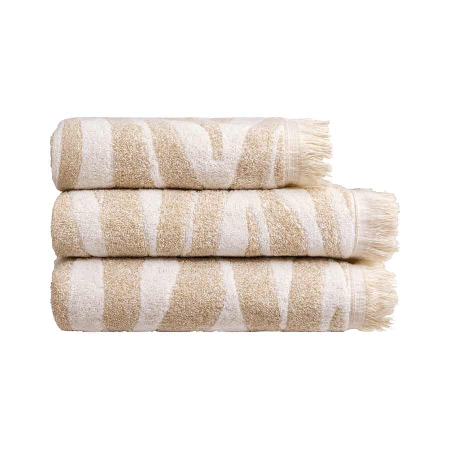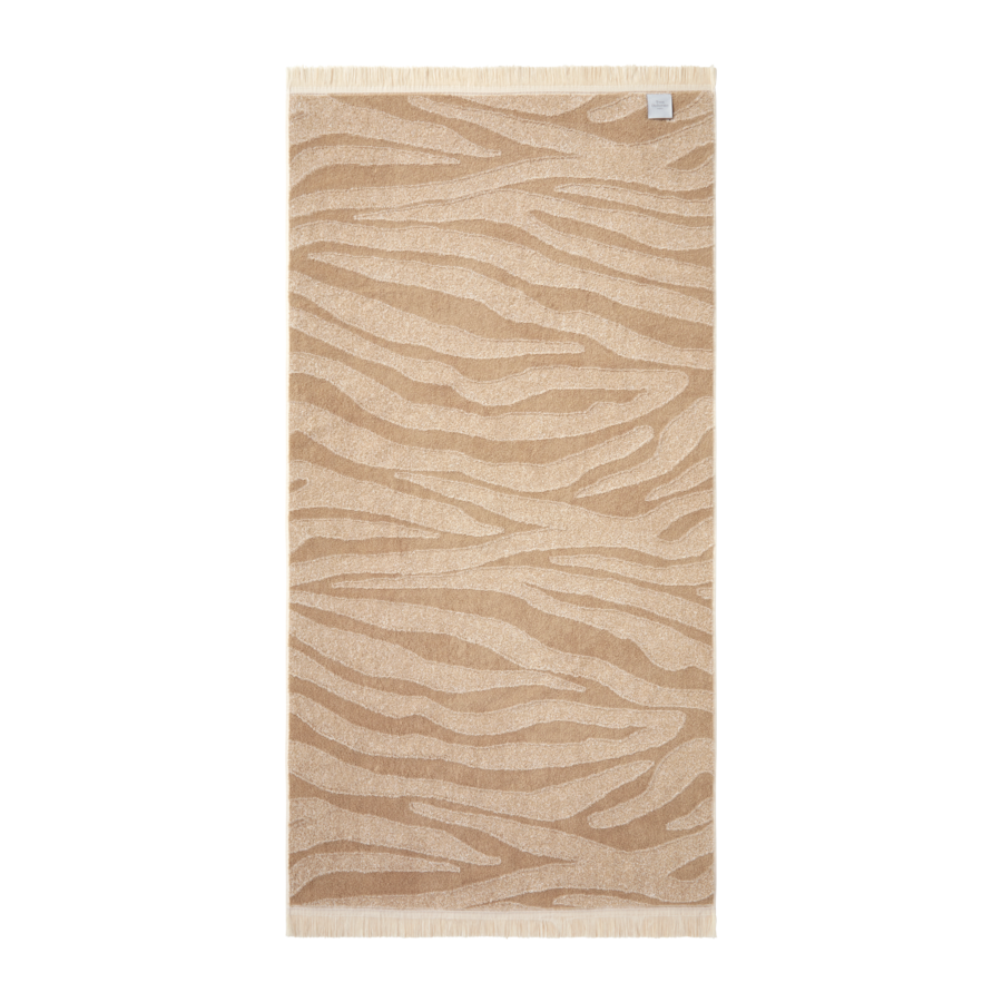 Yves Delorme's Faune Bath Linens Collection is soft in color. Its design is of an animal pattern. The colors are golden sand and cream. Terry jacquard. Fringe finish. 100% organic cotton, 550 gsm. Made in France.
