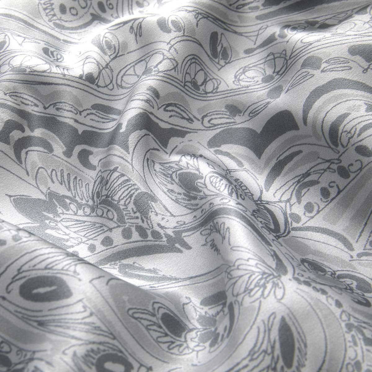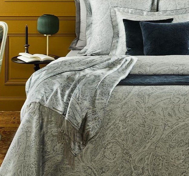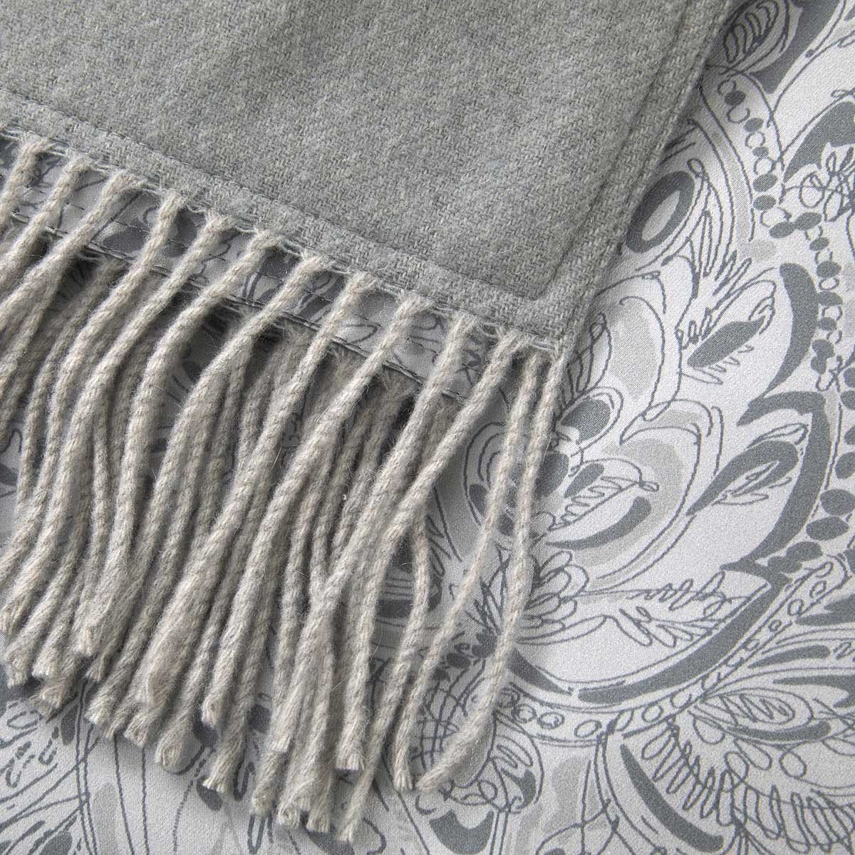 Yves Delorme's Foulard is a luxurious throw that has a design that emulates the Foulard bedding pattern. A true classic in a foulard paisley in shades of grey, this throw is equally comfortable in a living room. This is a very luxurious tone on tone silk that will transport you to distant lands. It is printed on 100% silk on the front. Solid color 100% cashmere in a complementary grey on the back. 51'' x 67'', fringes finish. Made in Lithuania for Yves Delorme.