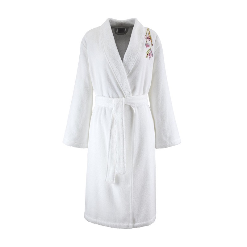 Crafted from a luxurious blend of organic cotton and modal, the Gaura Bath Robe delivers exceptional softness and absorbency at 450 g/m. This Turkish-made piece showcases understated botanical embroidery that evokes natural elegance—delicate plant motifs rendered in an airy, graphic style. The women's silhouette features a refined shawl collar, functional pockets, adjustable belt, and shoulder embroidery for refined detail. The fiber composition—83% organically grown cotton and 17% modal—ensures durability alongside a gentle touch against skin. An investment in everyday luxury that marries thoughtful design with sustainable materials.
