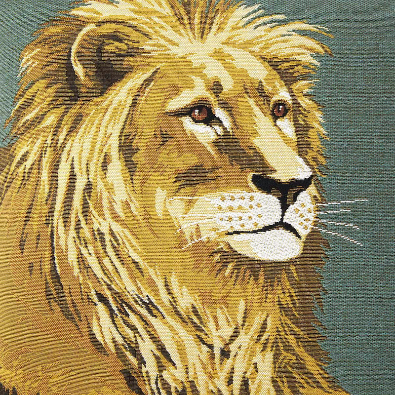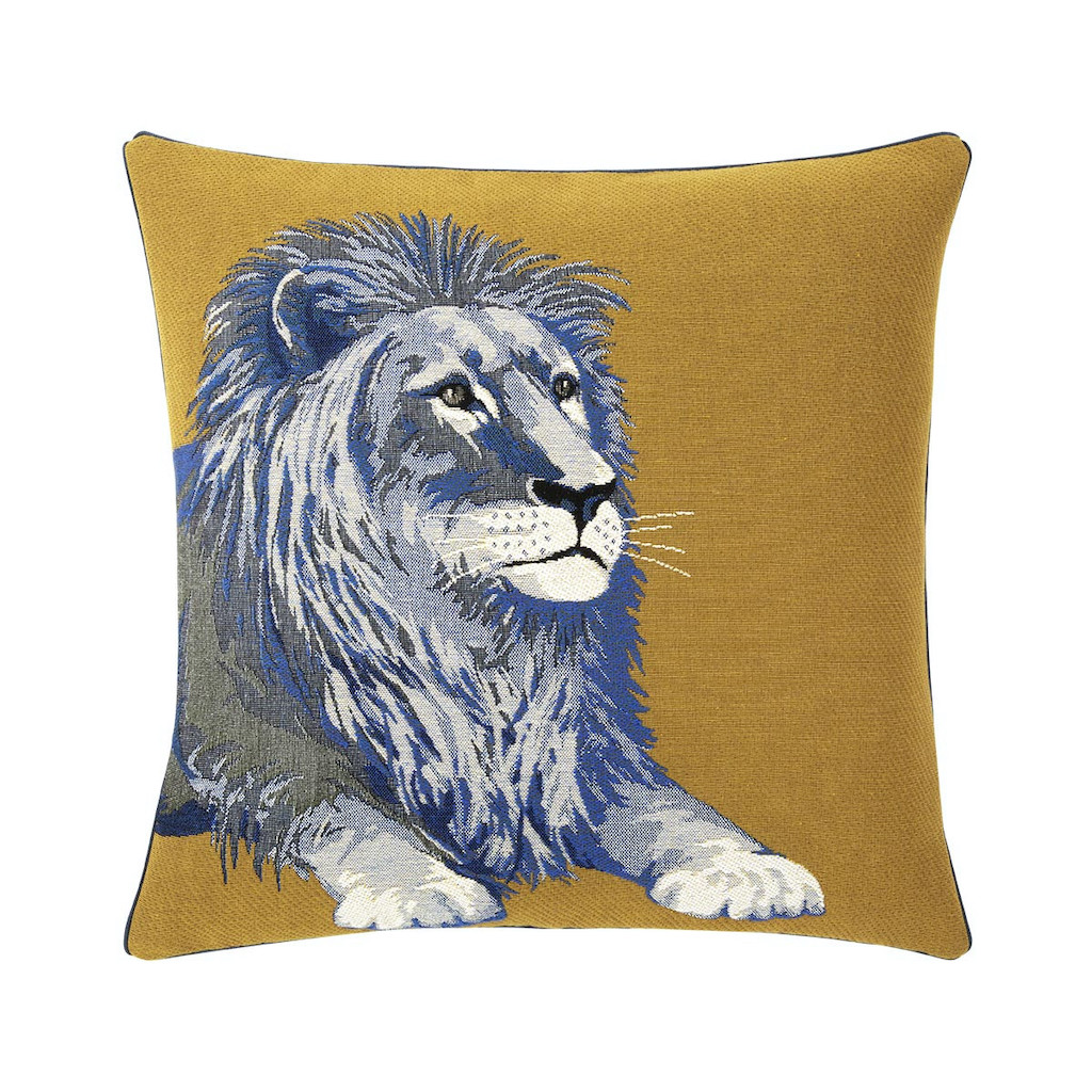 Iosis' decorative pillow Mimosa got its inspiration the king of the jungle. A swift portrait of the majestic lion of the savannah. Woven tapestry, lion portrait, piped finishing around perimeter, zipper closure along bottom side, 18 in x 18 in. Available in 2 colors: Ambre & Savane. Down & feather insert included.