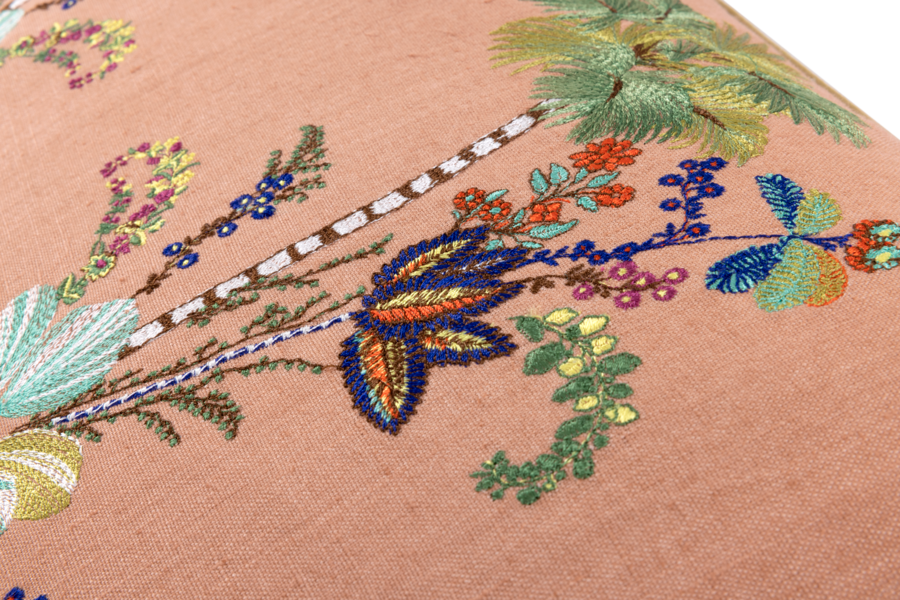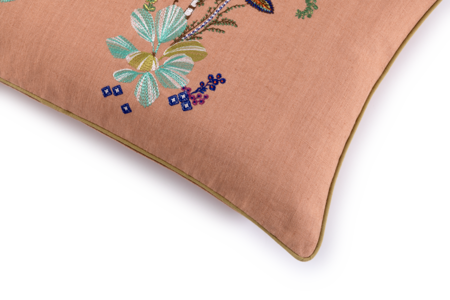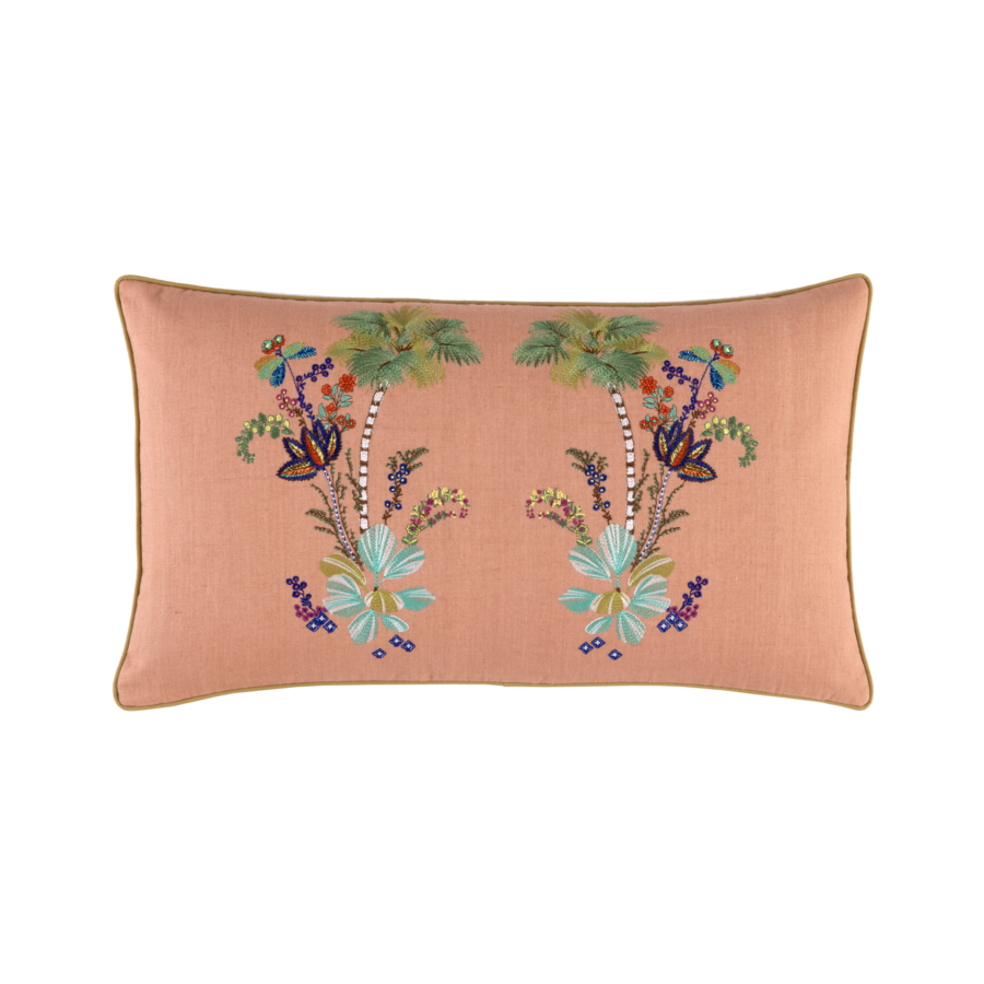 Yves Delorme's Jardins Decorative PiIlow is a great way to add a focal point and a pop of color to your bed or favorite chair. Cushion cover. Front embroidered, back in solid color. Piped finish. Zipper closure at bottom. 100% linen. 13" x 22". Made in India.
