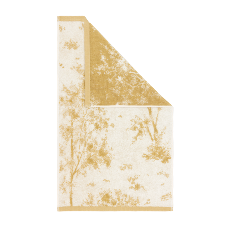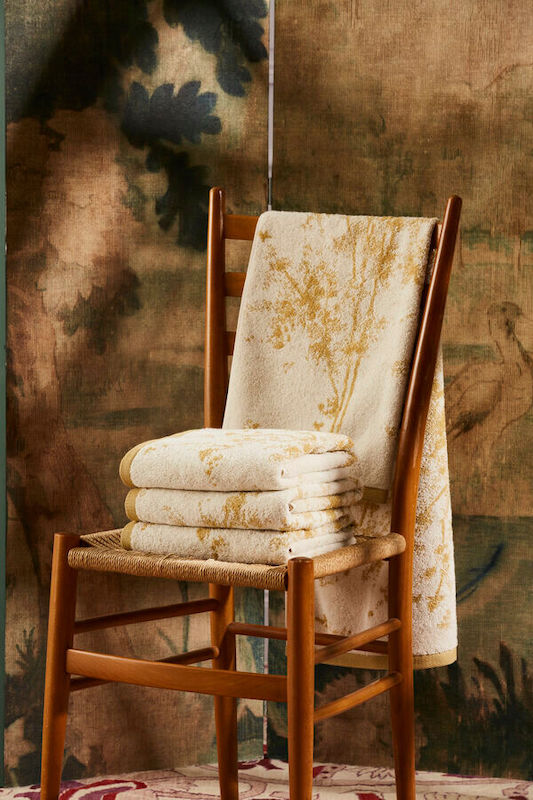 Yves Delorme's Legende Bath Linens Collection is graceful. The design is of foliage that tells a story of delicate weaving in golden light. Terry two color jacquard towel with a border finish. 100% organic cotton, 470 gsm. Made in France.