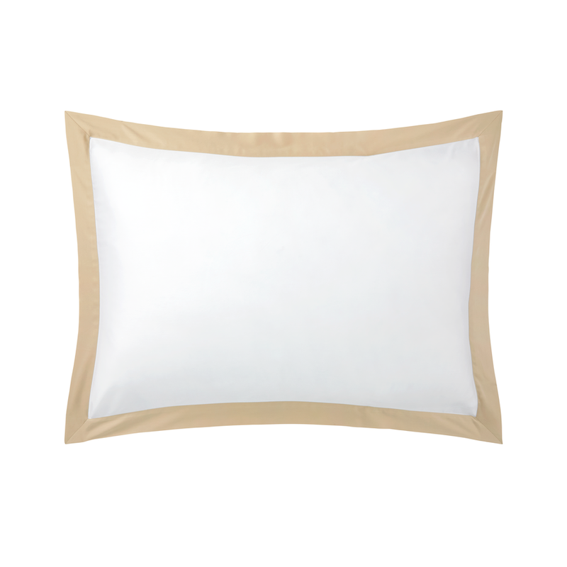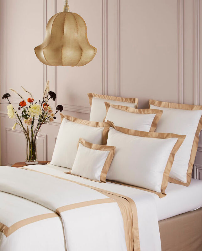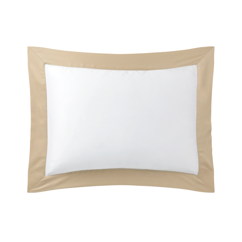Yves Delorme Linea in Dune has appliqué bands on white cotton sateen. This new, timeless design offers a soft and plush touch of cotton sateen combined with the natural and refined colors Sateen bed linens. Duvet cover with colored sateen appliqué in U shape - button finish, flat sheet with 2” hem in colored sateen, shams with 2" flounce in colored sateen. 100% long staple combed organic cotton from organic farming, 300 thread count. Made in France.