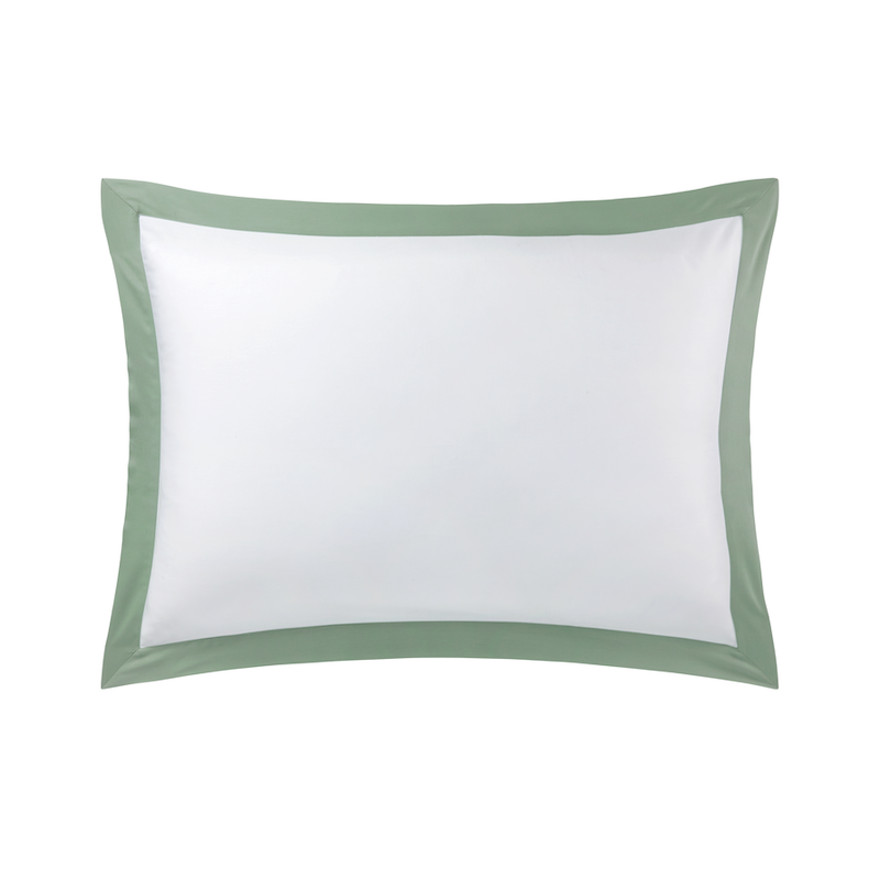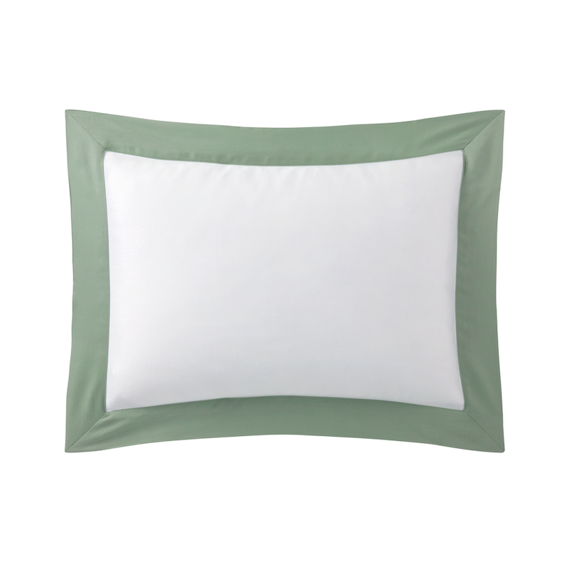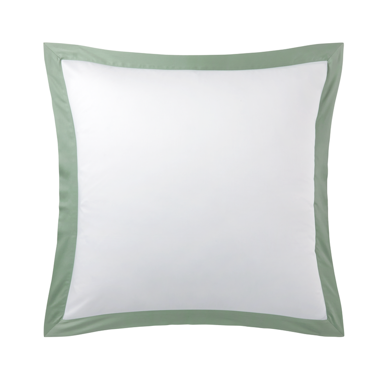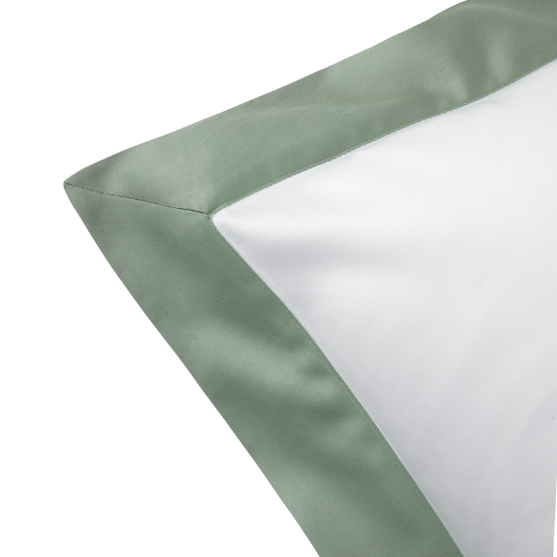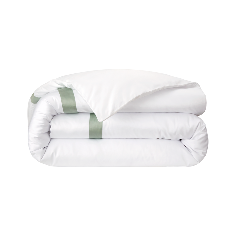 Yves Delorme Linea in Veronese has appliqué bands on white cotton sateen. This new, timeless design offers a soft and plush touch of cotton sateen combined with the natural and refined colors Sateen bed linens. Duvet cover with colored sateen appliqué in U shape - button finish, flat sheet with 2” hem in colored sateen, shams with 2" flounce in colored sateen. 100% long staple combed organic cotton from organic farming, 300 thread count. Made in France.