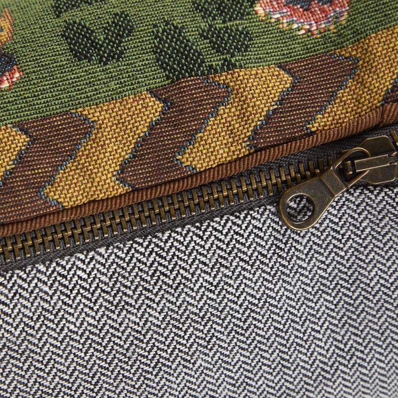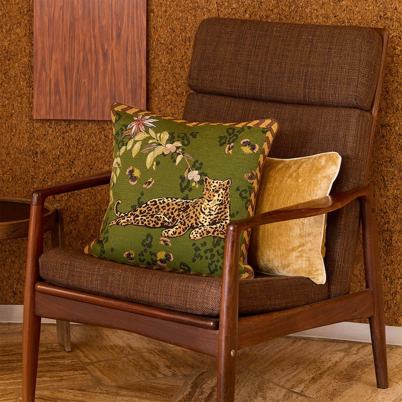 Crafted in Belgium, the Orchidia decorative pillow in Kaki merges artistic sophistication with tactile refinement. Its jacquard-woven cotton front features an evocative panther silhouette nestled among delicate orchids—a composition that balances nature's grace with refined design sensibility. The front fabric blends 74% cotton with acrylic, polyamide, polyester, and viscose for durability and subtle texture, while the reverse showcases a micro-herringbone weave in cotton-polyester. Finished with precise piping that accentuates the design's intricacy and a discreet bottom zipper, this pillow exemplifies the intersection of botanical artistry and structural craftsmanship.