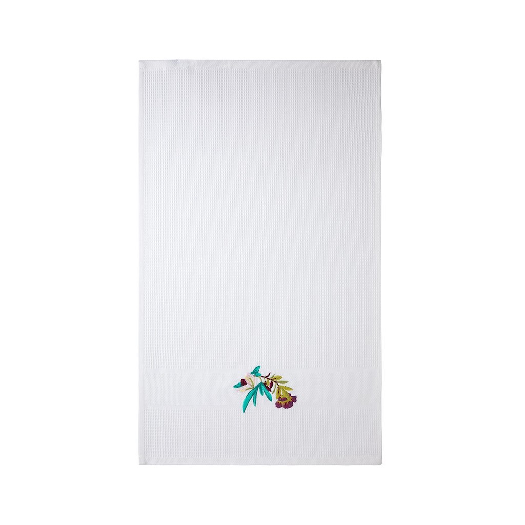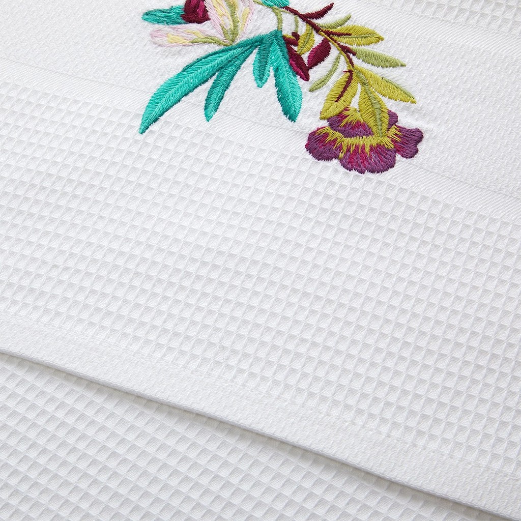 Yves Delorme's Panorama Fingertip Towel Set is a set of two honeycomb waffle towels with floral embroidery.