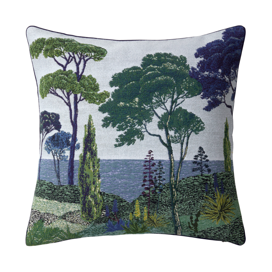 Yves Delorme's Parc Iosis Decorative Pillow is spectacular. Stone pines, cypresses and agaves form an idyllic panorama, facing the sea. The ink drawing is colored in two variations, Parme and Azur. Cotton Jacquard tapestry. 18" x 18" cushion cover, tapestry. Solid back in Bronze color linen. Piped finish and zipper closure at the bottom of the cushion cover. Front: 74% cotton / 12% acrylic / 6% polyamide / 5% polyester / 3% viscose. Back: 100% linen. Made in Belgium.