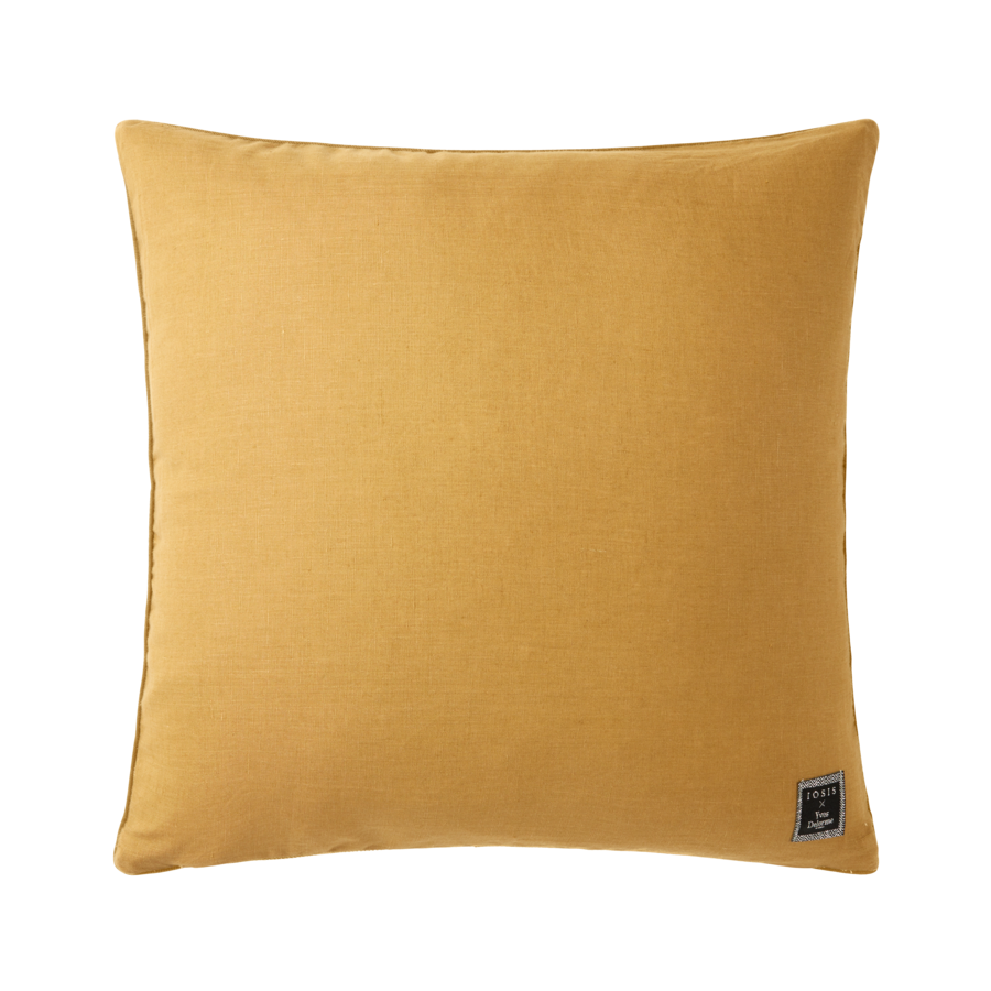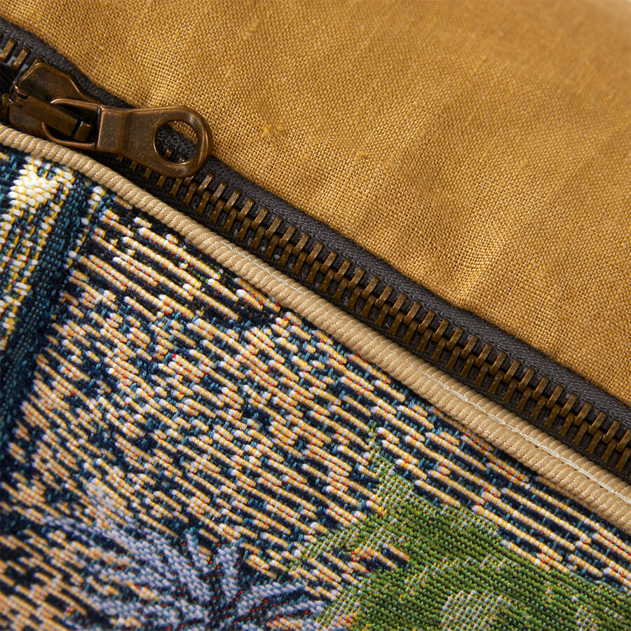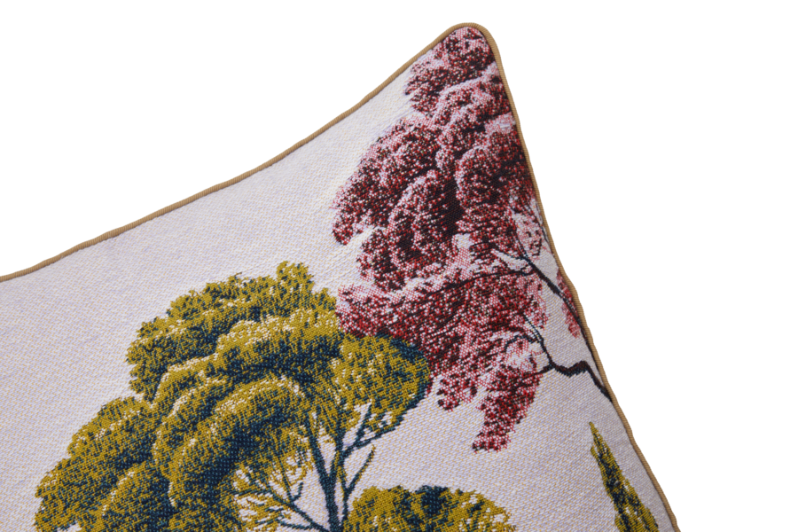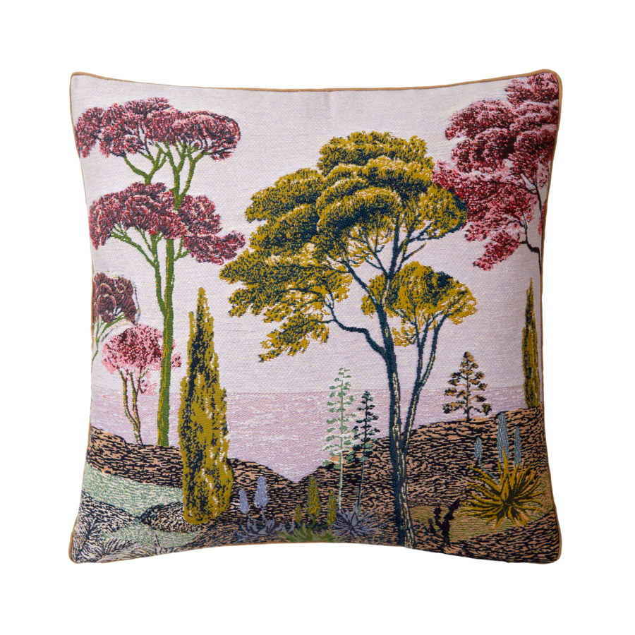 Yves Delorme's Parc Iosis Decorative Pillow is spectacular. Stone pines, cypresses and agaves form an idyllic panorama, facing the sea. The ink drawing is colored in two variations, Parme and Azur. Cotton Jacquard tapestry. 18" x 18" cushion cover, tapestry. Solid back in Bronze color linen. Piped finish and zipper closure at the bottom of the cushion cover. Front: 74% cotton / 12% acrylic / 6% polyamide / 5% polyester / 3% viscose. Back: 100% linen. Made in Belgium.