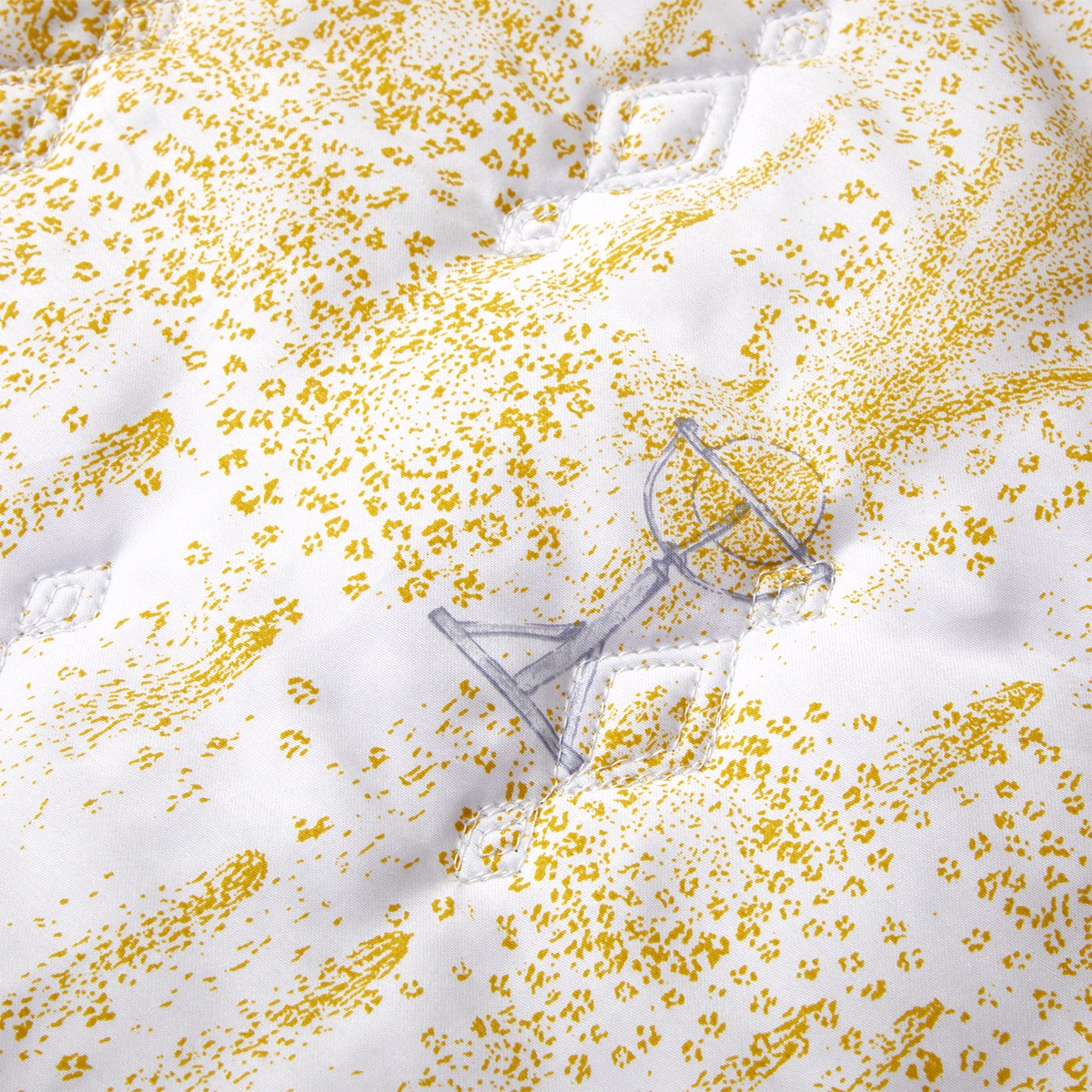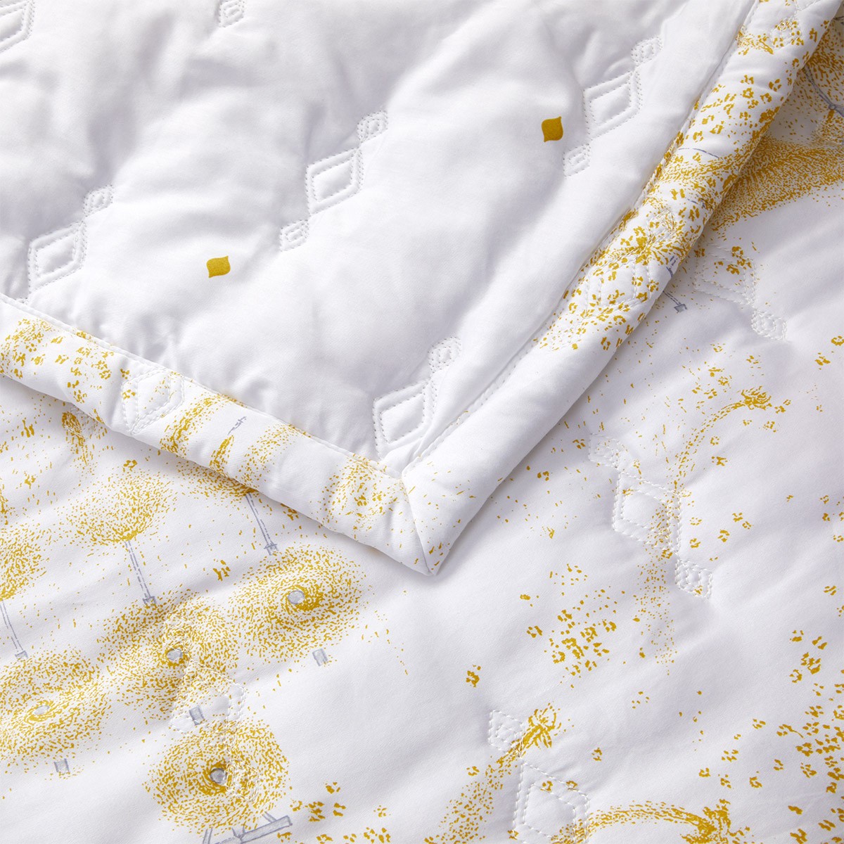 Yves Delorme's Royal Quilted Coverlet is inspired by the stunning fireworks display at Versailles along the intricate architecture. The golden color represents the opulence of the Sun King. Printed in three colors for the main design. Diamond pattern quilted coverlet. 100% polyester padding. 1" hem finish. 300 thread count. 100% organic long-staple combed cotton sateen. Made in Tunisia.