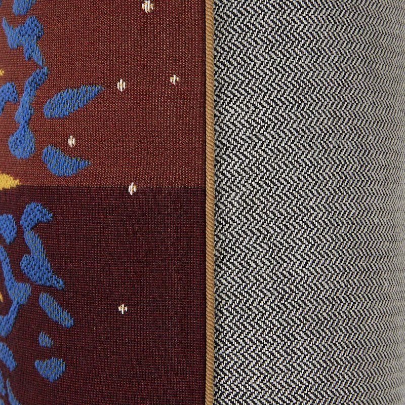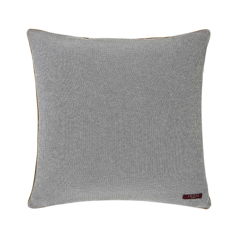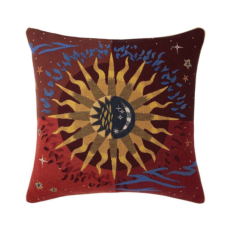Iosis' Soleil Decorative Pillow is tapestry that is woven and embroidered with a classic celestial sun on the front and reverses to a soft grey micro herringbone. It has a piped finish around perimeter. Zipper closure along bottom side. 18 in x 18 in. Made in Belgium.